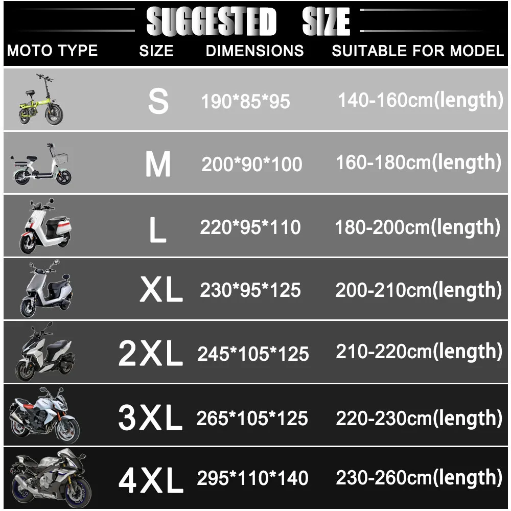 Size:s-4xl1.Our unique Heavy duty UV & Water repellent treated fabrics covers is protects against rain, wind, snow, sun, bird poop, tree sap and dirt and won't crack in cold weather,protect Motorcycle from sun,rain,water damage.2.Front and back elastic cord sewn in the bottom for tight fit.All seams are top stitched with heavy duty nylon thread.your motorcycle with motorcycle locks (not included)Fitment:Universal fit most standard motorcycle models(The size diagram of the car cover is attached below for reference)Package List: 1 x Motorcycle cover1 x gift bag