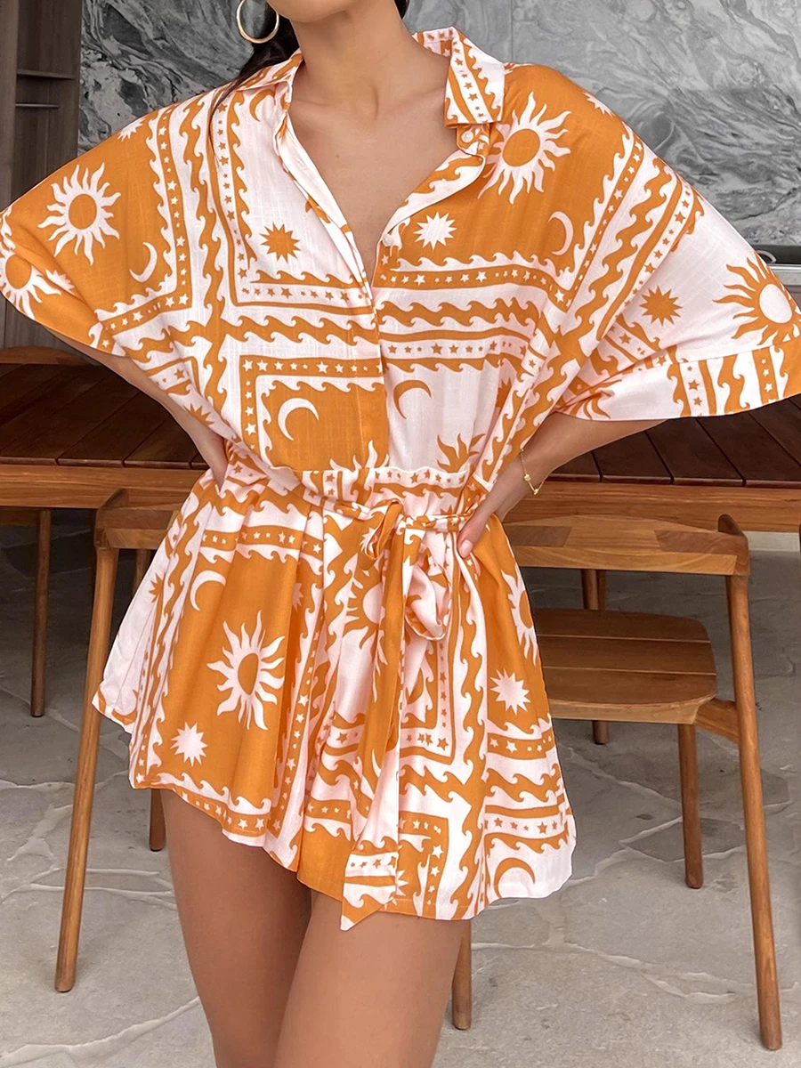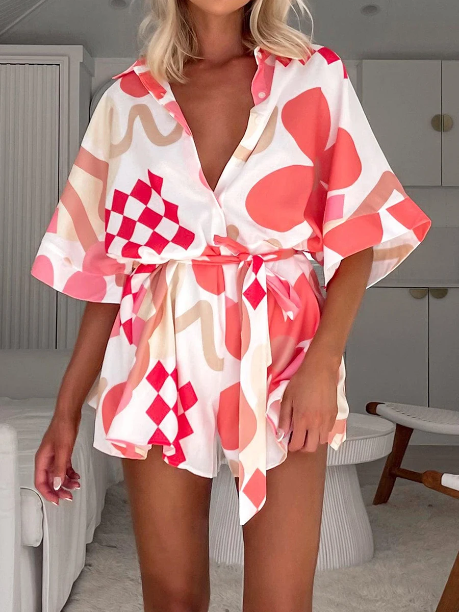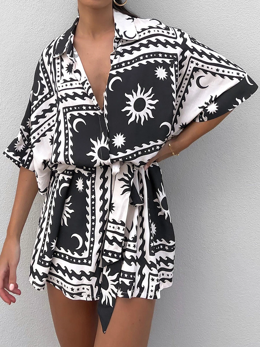 hirigin Women Vintage Boho Floral Printed Romper Half Sleeve Button Down V Neck Jumpsuit Wide Leg Waist Tie Jumpsuit Playsuit