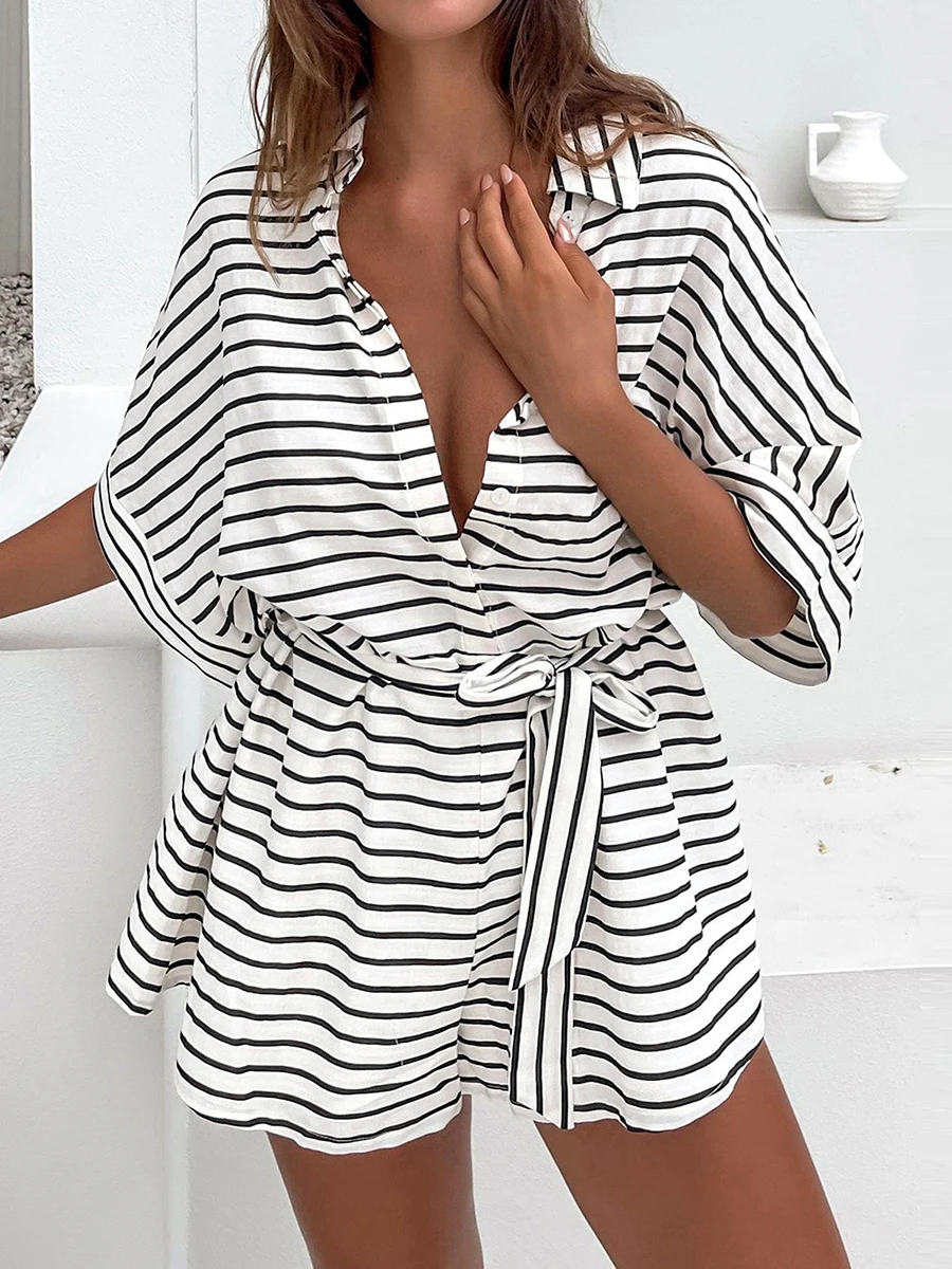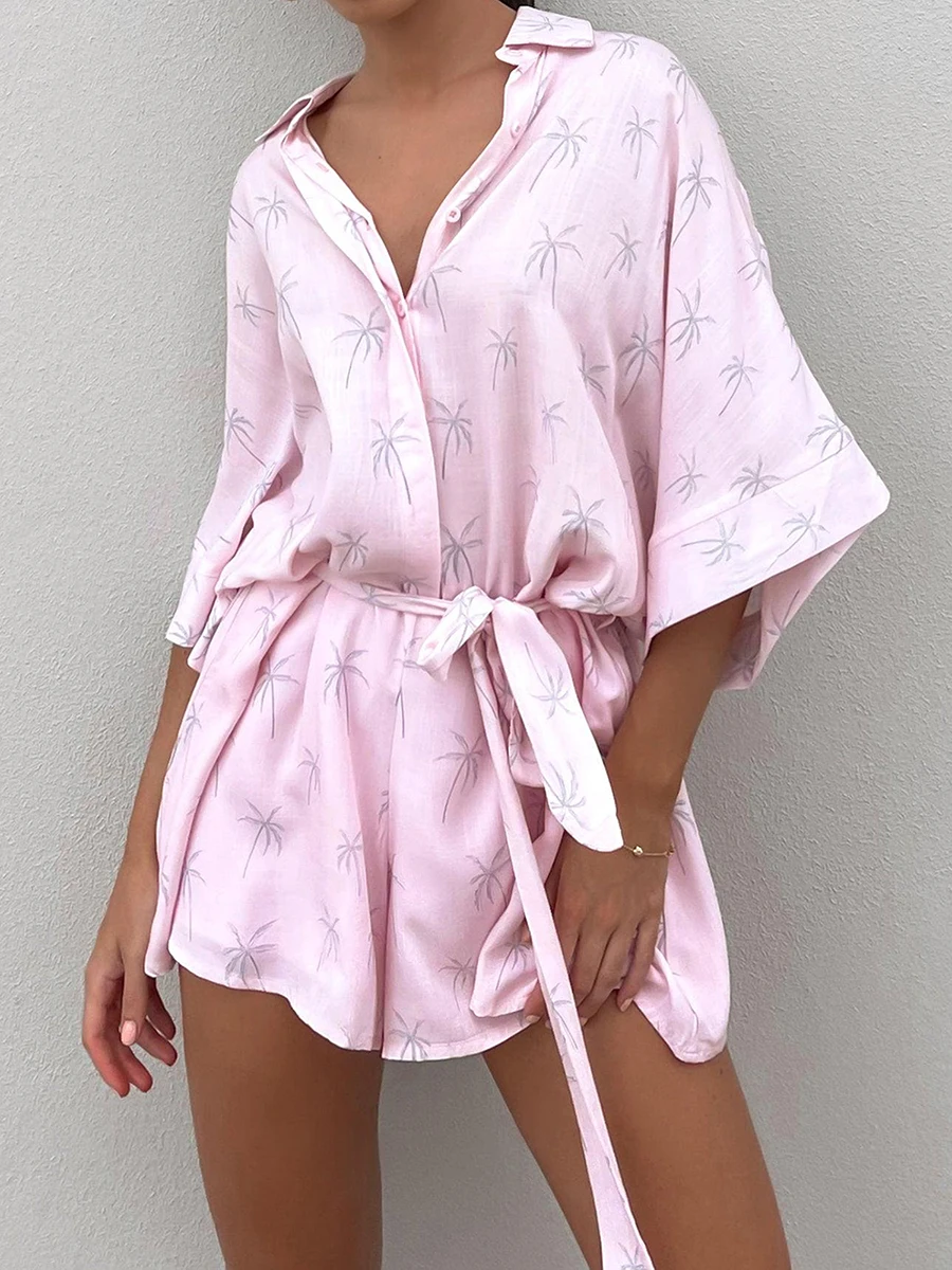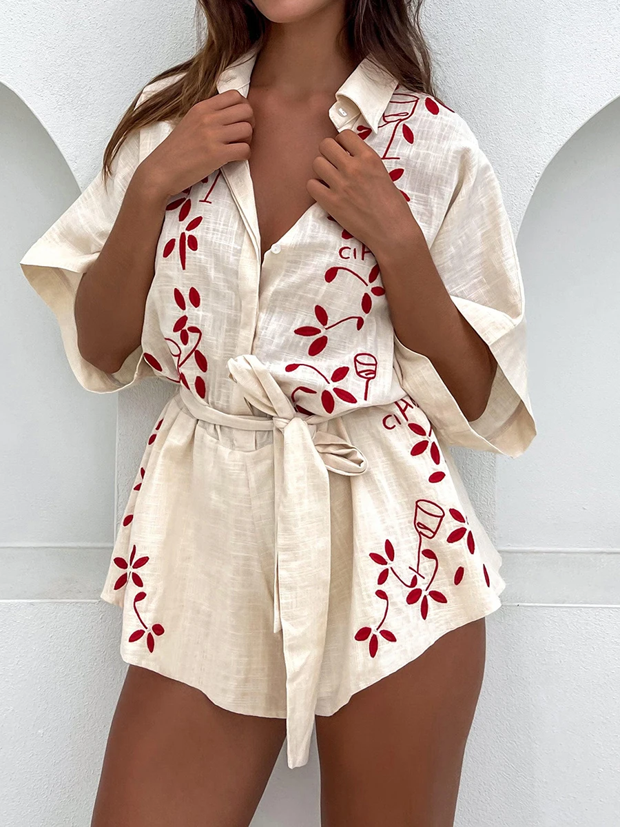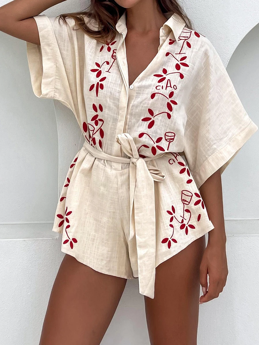 hirigin Women Vintage Boho Floral Printed Romper Half Sleeve Button Down V Neck Jumpsuit Wide Leg Waist Tie Jumpsuit Playsuit