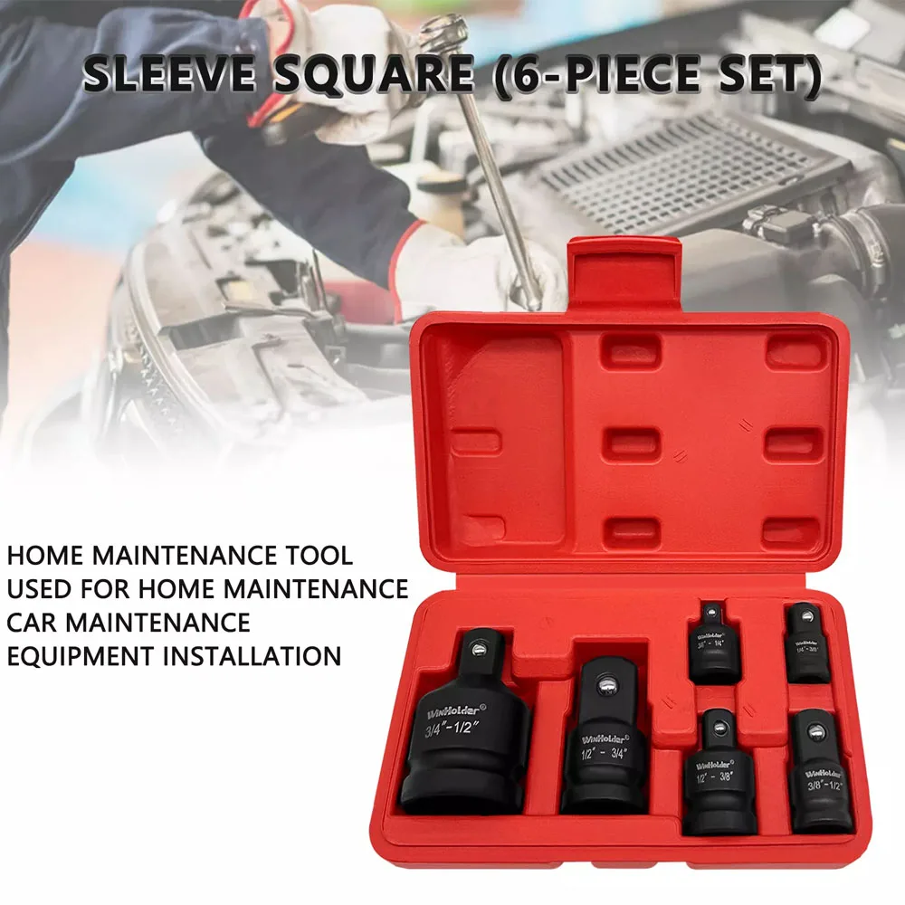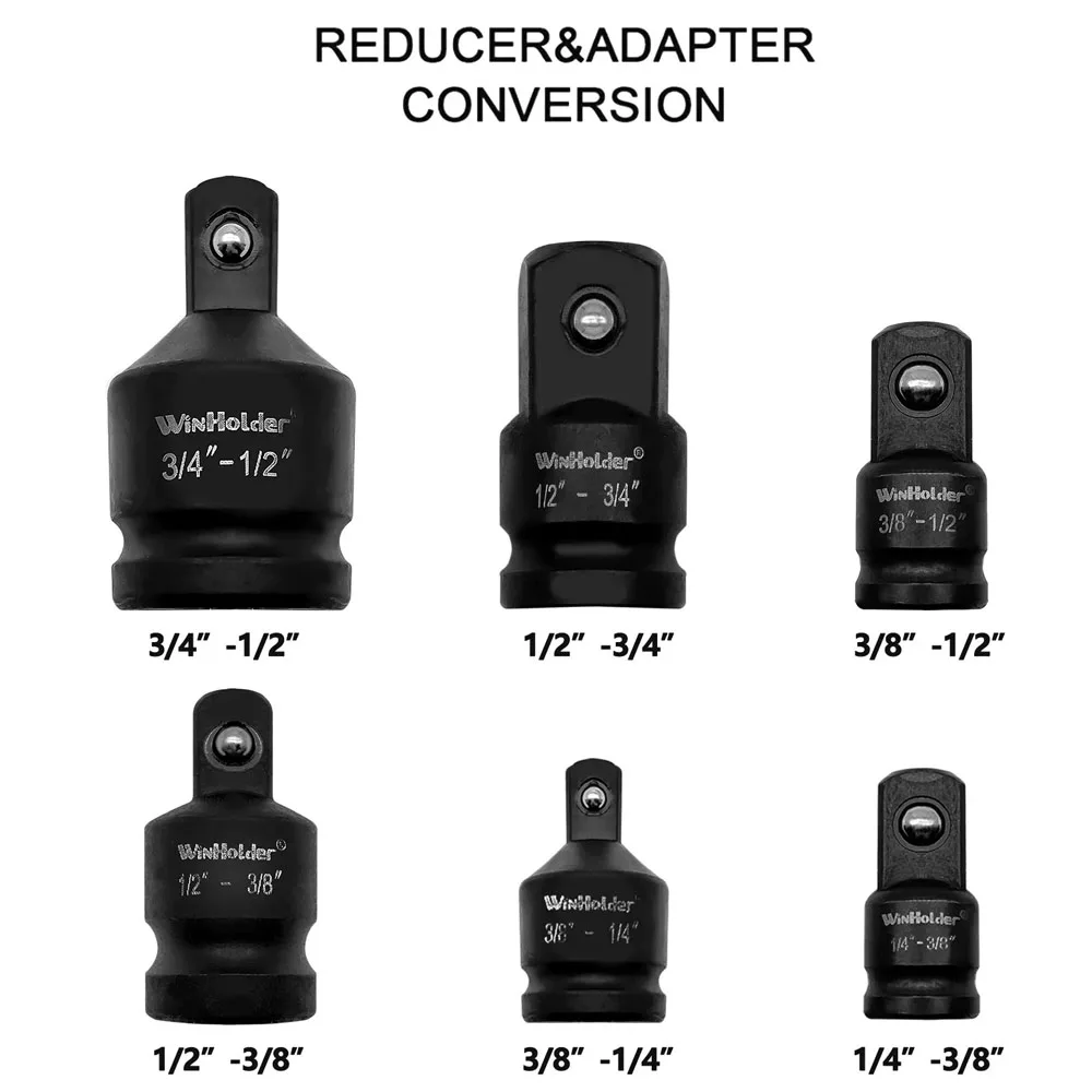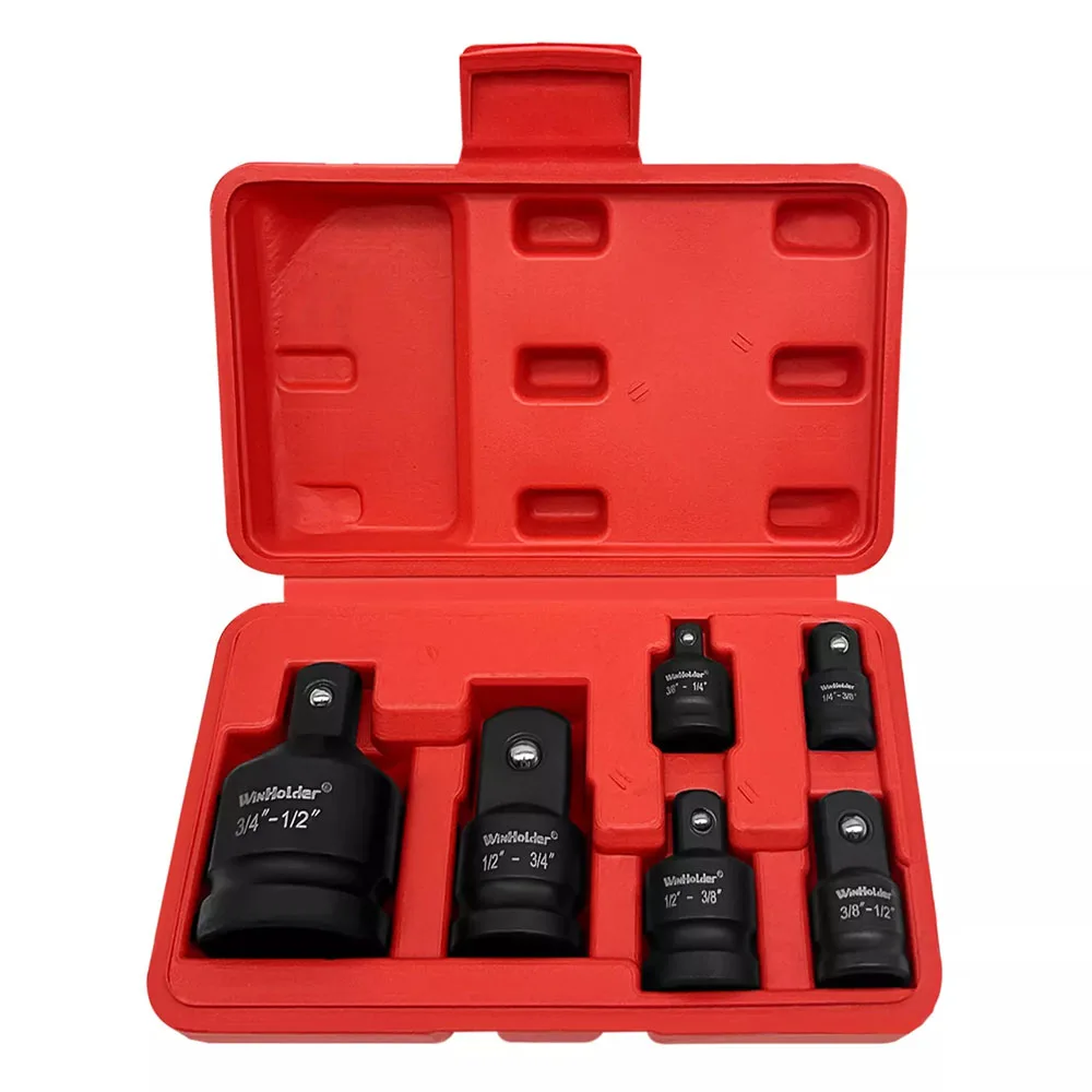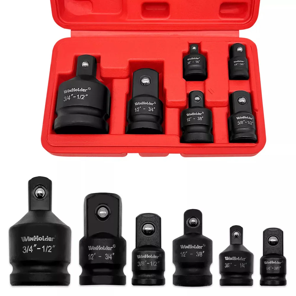 Set includes 3/8" to 1/4" Adapter, 1/2" to 3/8" Adapter, 3/4" to 1/2" Adapter, 1/4" to 3/8" Adapter, 3/8" to 1/2" adapter, and 1/2" to 3/4" adapter for all your home improvement or auto jobs.