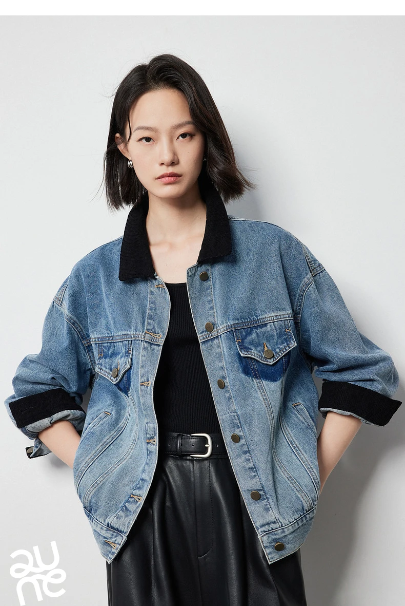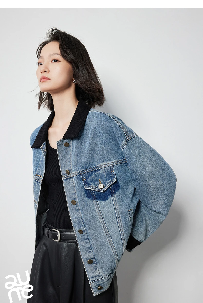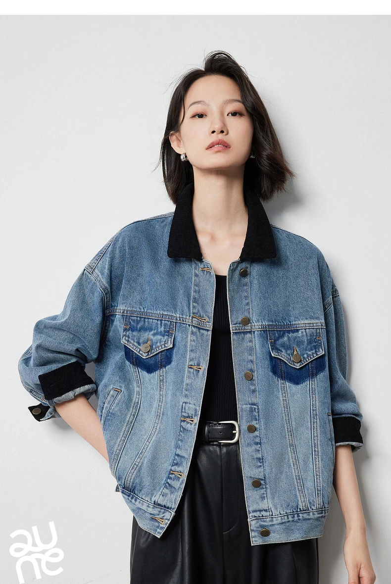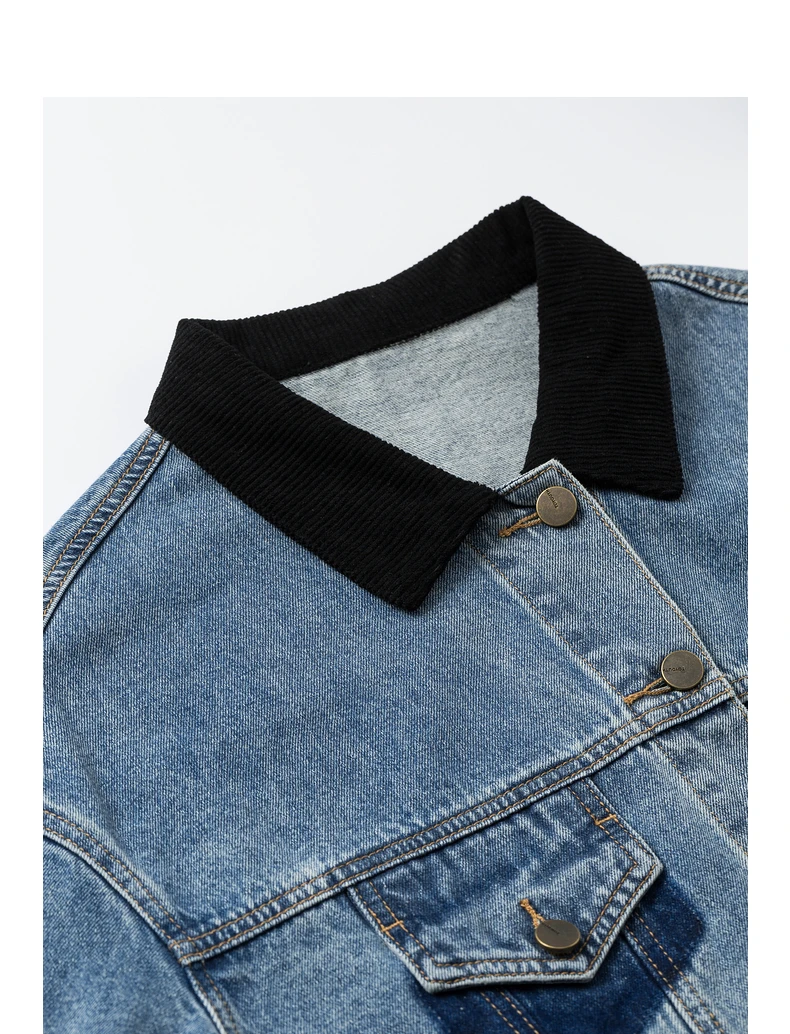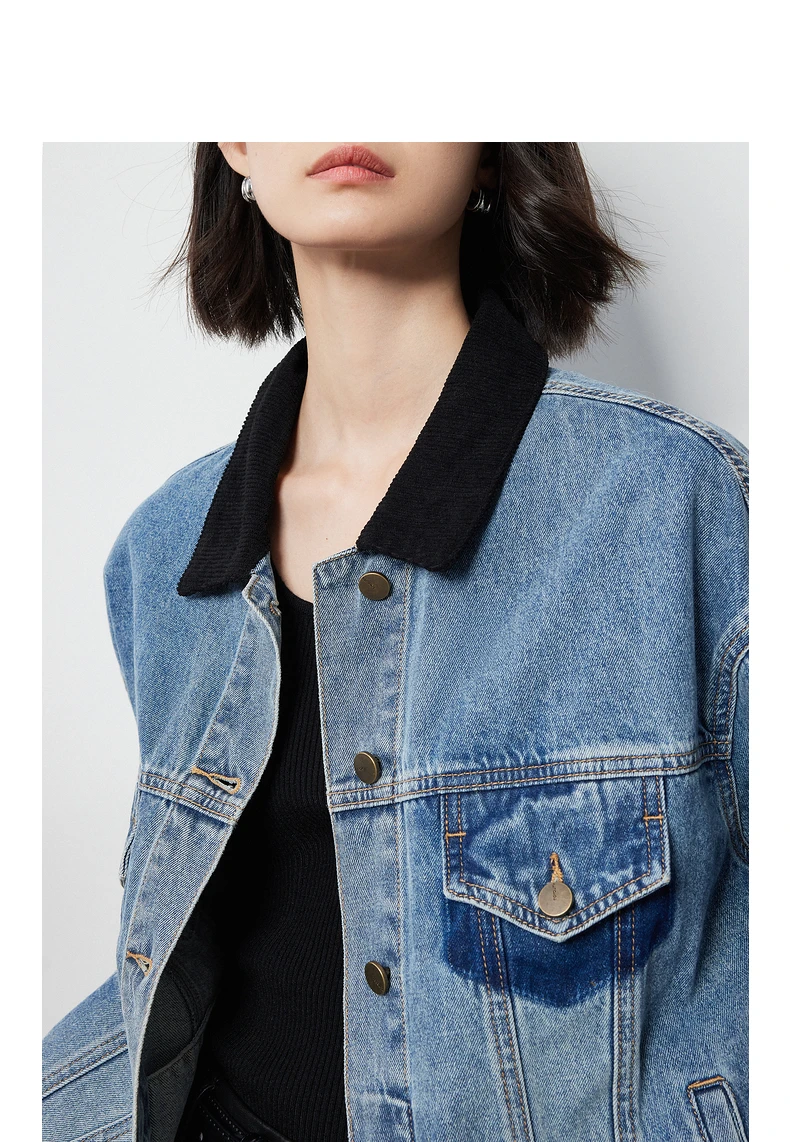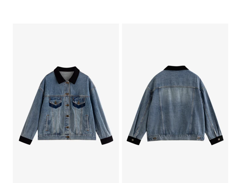 TOYOUTH Women Denim Jacket 2024 Autumn New Contrasting Color Washed Boyfriend Streetwear Outwear Jacket