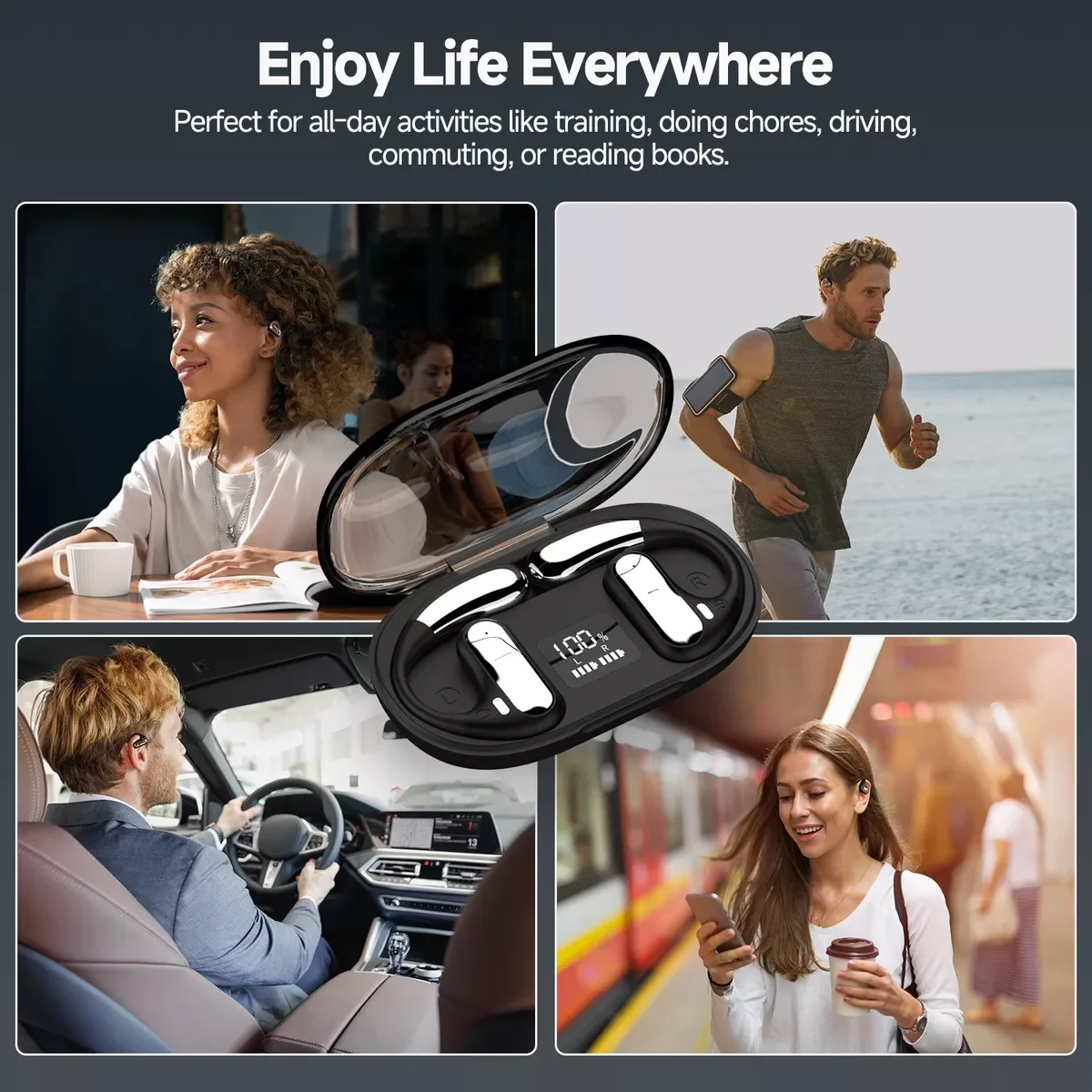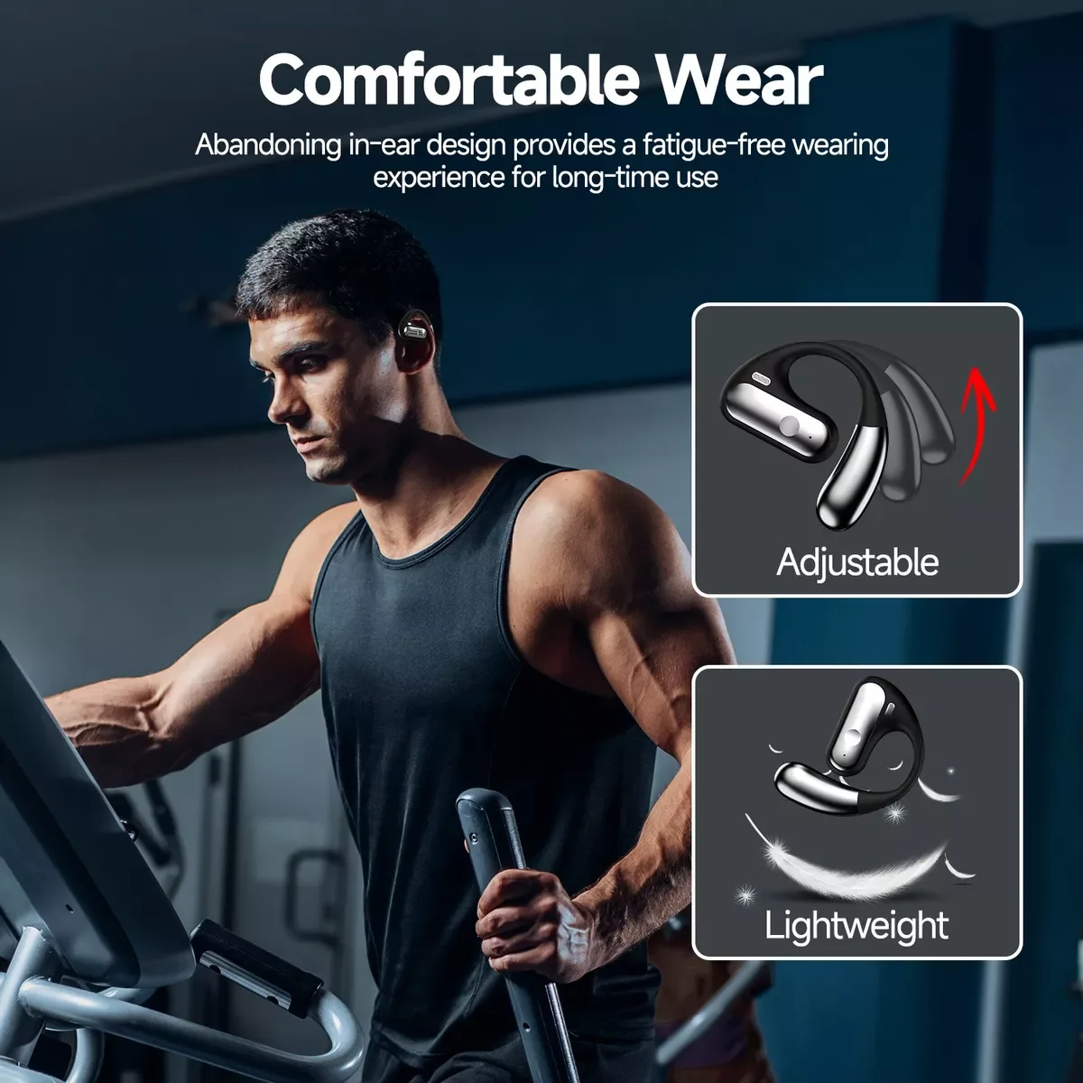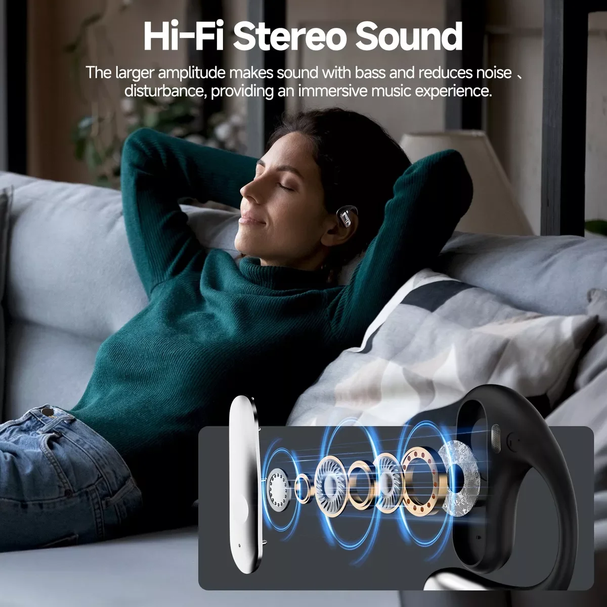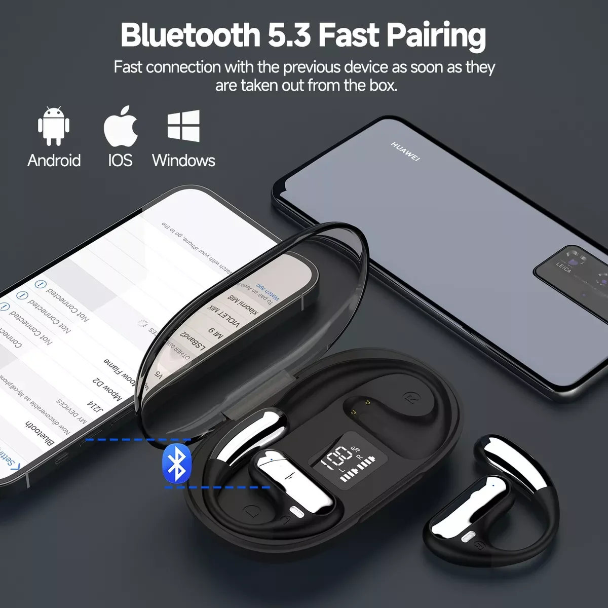 Uso confortável e sem toque: em vez de inserir fones de ouvido nos ouvidos, nossos fones de ouvido apresentam um design ergonômico de gancho para fornecer um ajuste estável ao formato do ouvido e uma experiência de uso sem fadiga, mesmo durante o uso prolongado. Eles são muito leves para fazer você sentir sua existência depois de usá-los o dia todo. Além disso, os fones de ouvido abertos também proporcionam consciência ambiental, permitindo que você fique conectado com o que está ao seu redor.