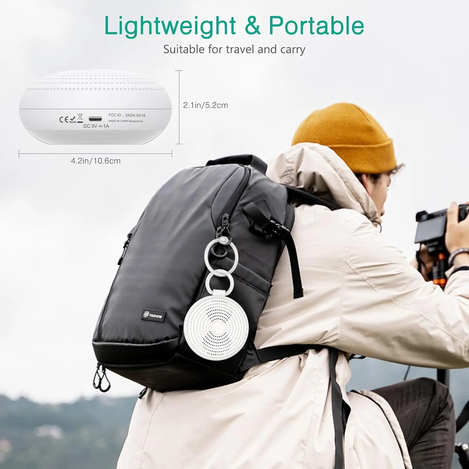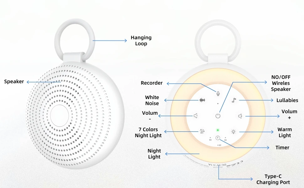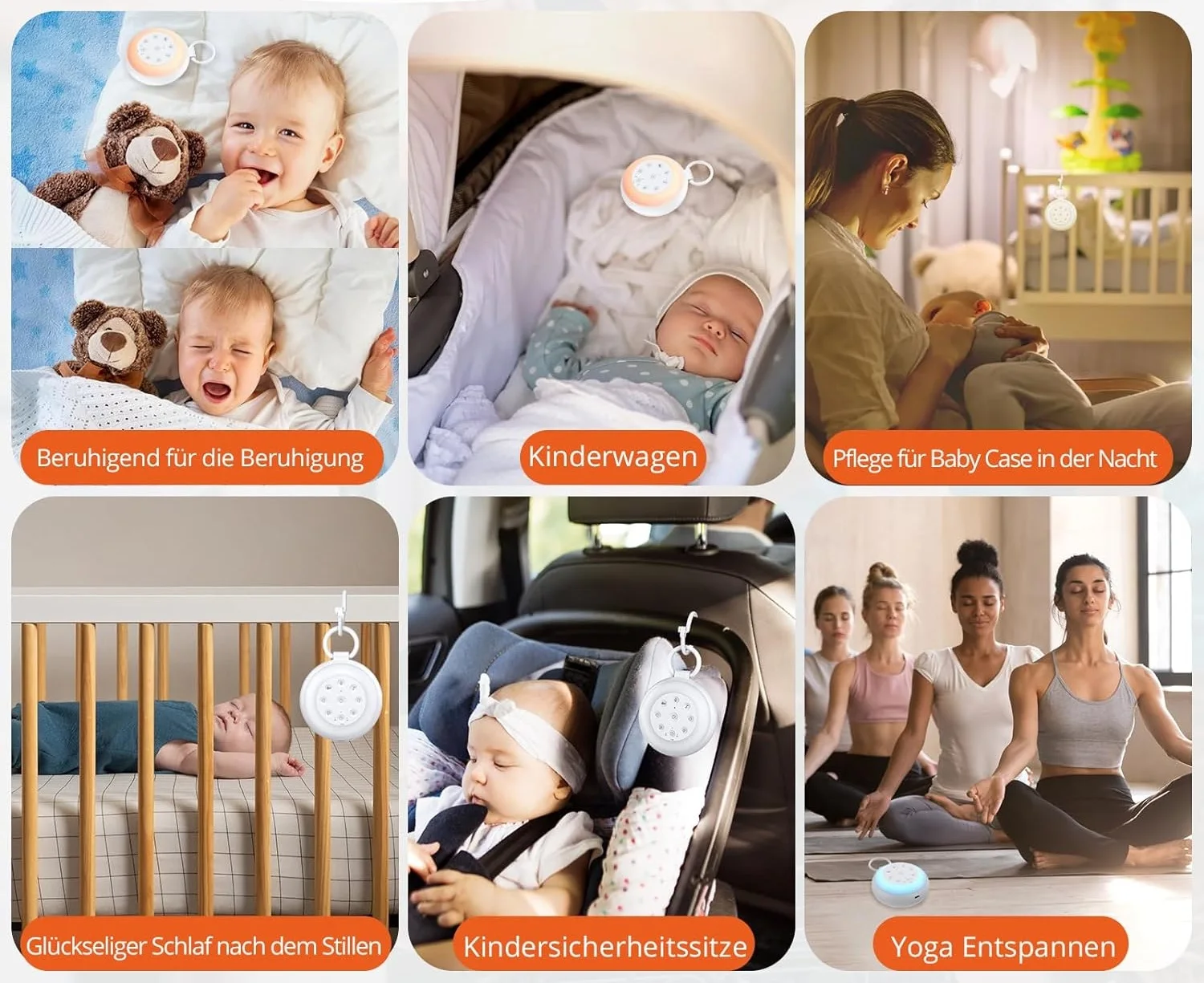 • [Portable & Cordless] The Baby Sleep Aid Machine with Ultra-Portable and Cordless Design. It's Small and Lightweight(250g), Making it a Perfect Travel Noise Machine. With a Detachable Hanging Ring, You Can Easily Hang it on Your Pram, Car Seat, or Suitcase. Take it with You on Walks, Hotel Stays, or Business Trips to Enjoy Portable Freedom.