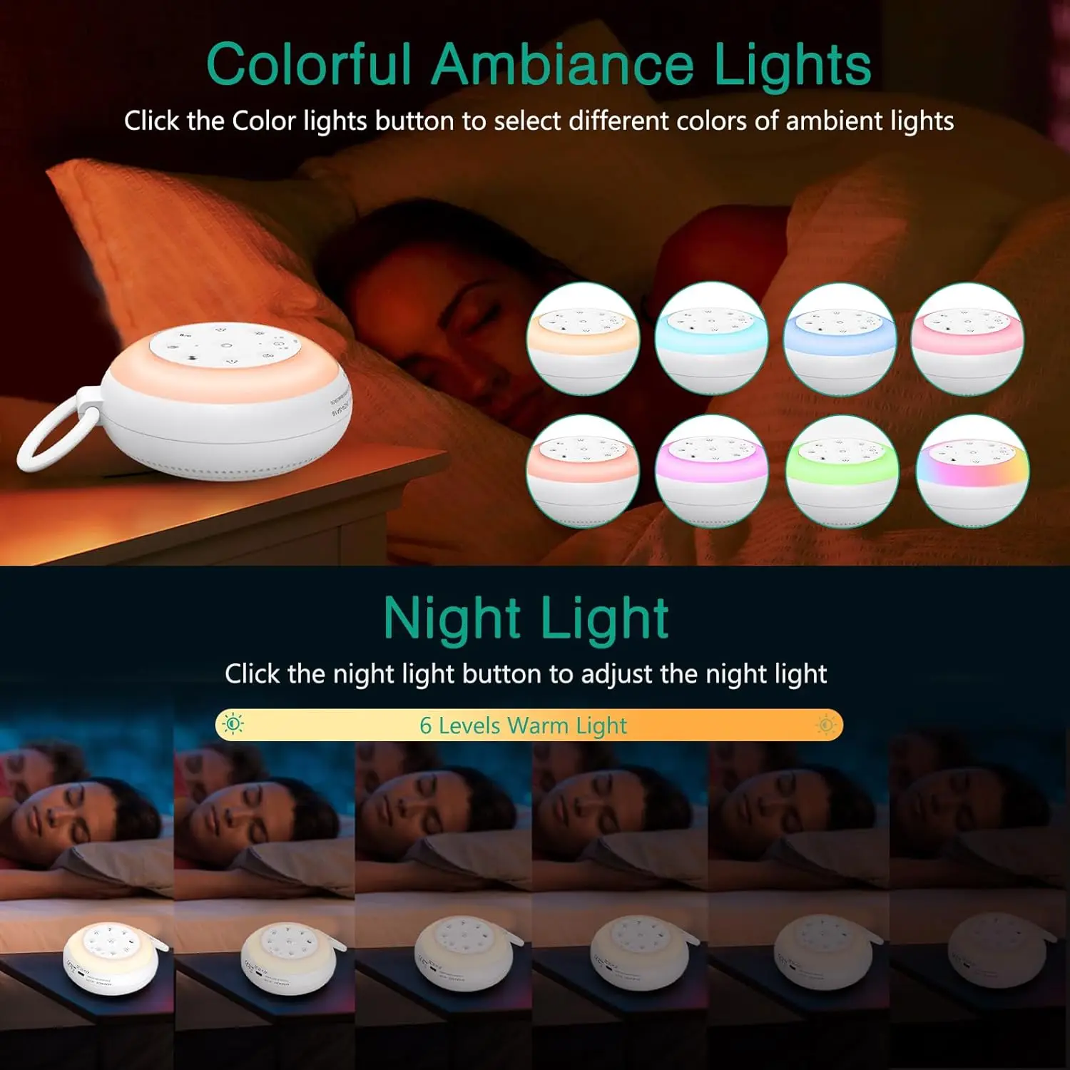 • [Long Endurance]The White Noise Machine for Adults with Night Light Features a Powerful Battery with up to 50 Hours Play Time. Easily Lasts through the Night and Daytime Naps on a Single Charge.