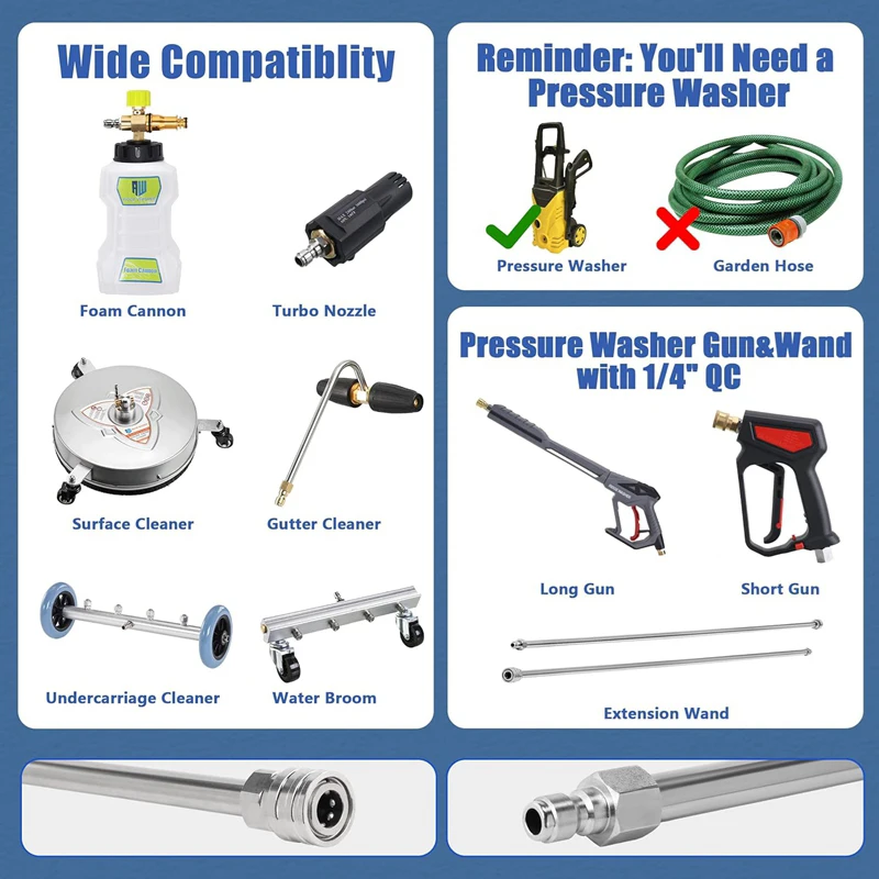 1/4'' Quick Connect: Fits 1/4'' quick connect and 1/4'' quick plug compatible with most pressure washer guns and spray nozzles.