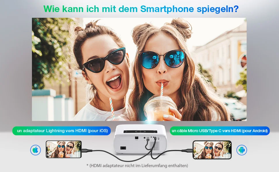 For iPhone/iPad: A lightning to HDMI adapter cable is required
