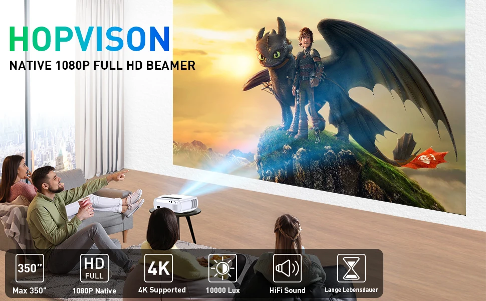 Clear, dynamic and vivid HD image: The HOPVISION HD video projector has been specially designed to meet the needs of our customers. It is equipped with a native resolution of 1080p (1920x1080p) and a brightness of 10000 lux, which ensures a clearer image.