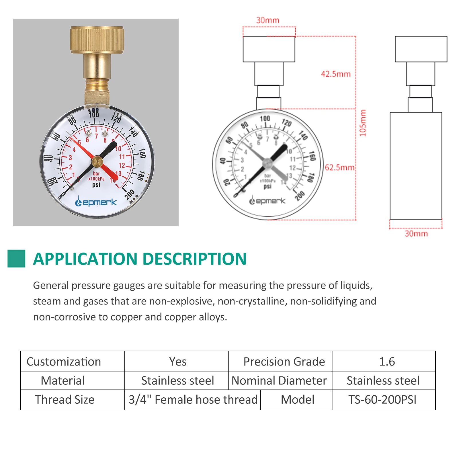 Lepmerk 2- 1/2'' Pressure Gauge Water Pressure Test Gauge 3/4'' Female Hose Thread 0-200 PSI with Red Pointer High Precision