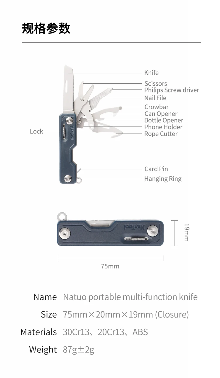 Function: Knife,Lock,Scissors,Philips Screw driver,Nail File,Crowbar,Can Opener,Bottle Opener,Phone Holder,Rope Cutter,Card Pin,Hanging Ring.