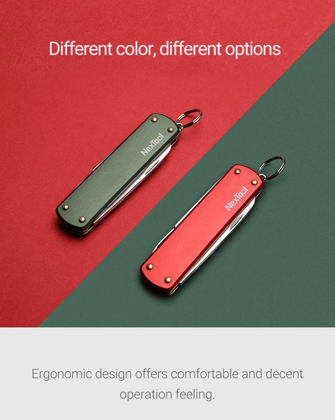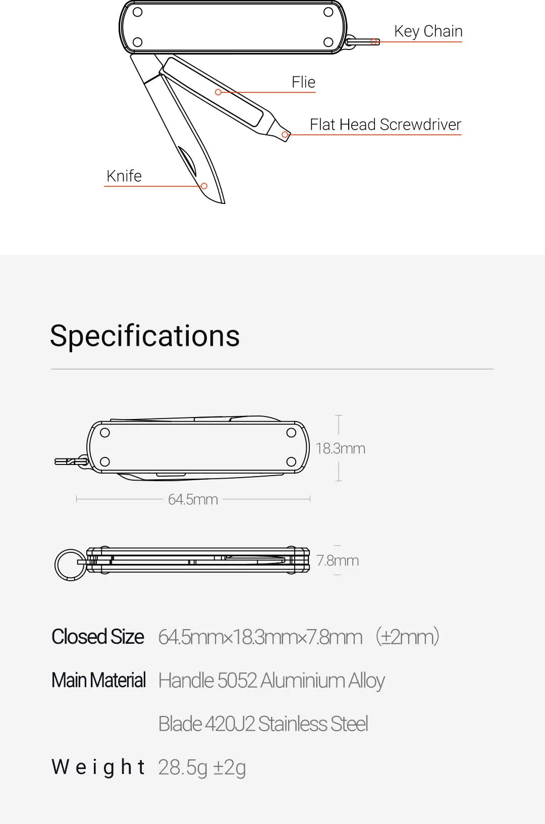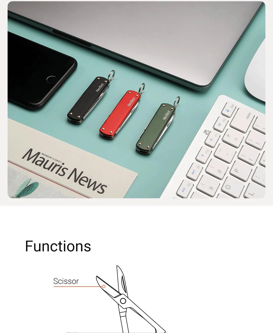 Functiion: Scissor, Nail File, Flat-head screw driver, Key ring, and knife