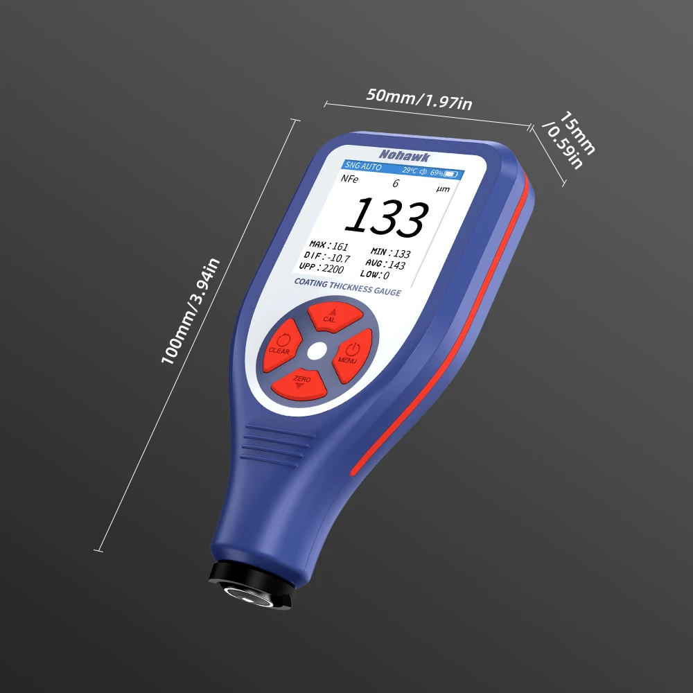 1.Accurate and reliable coating thickness measurement gauge with a color LCD for enhanced visibility. Built-in battery and automatic shutdown. Automatic recognition for iron (ferrous) and aluminum (non-ferrous) substrates.