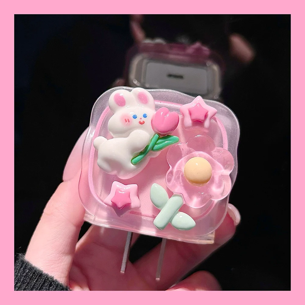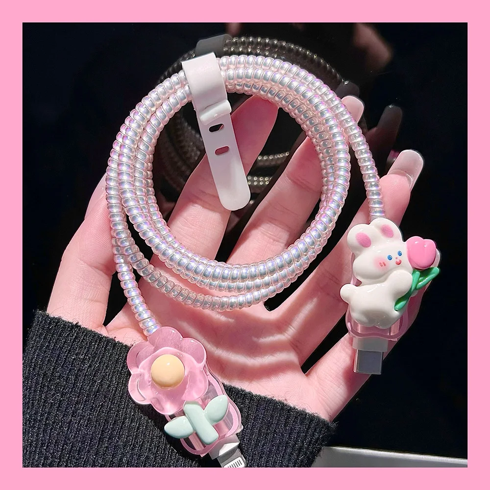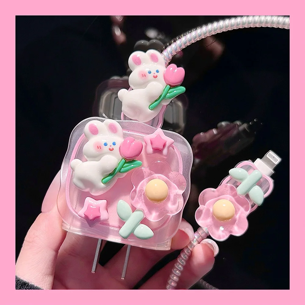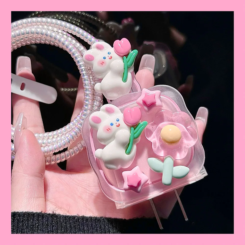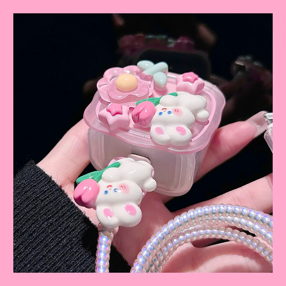 3D Flower Rabbit Charger Protection Cover 18W 20W US Fast Charging Protective Case For iPhone 11 15 12 13 14 Pro Max Wire Winder