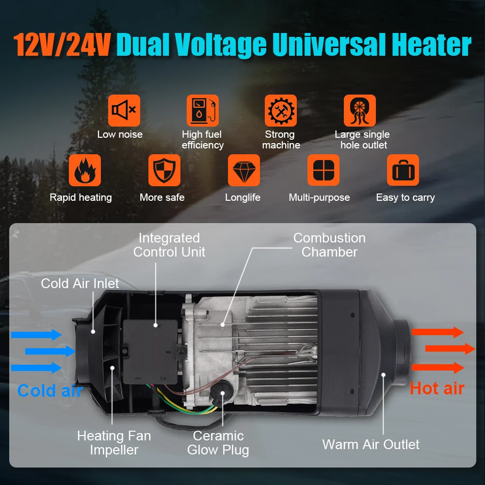 When the weather gets cold, whether it is resting in the car, driving, dining, etc., or working indoors, ships, workshops, warehouses, pastures, etc., the cold weather makes people uncomfortable, we provide you with 12V, 24V, dual-voltage diesel heaters to warm you throughout the winter. Heating diesel heating speed is fast, can quickly eliminate frost on the window. Low fuel consumption, low power consumption, suitable for long-term operation. You can install 12V, 24V universal upgrade diesel parking heaters in the car, in the field, outdoors or indoors wherever there is power and operate them efficiently via remote control or LCD panel. Our diesel heaters are a warm companion, allowing you to feel the warmth of summer even in the cold winter.