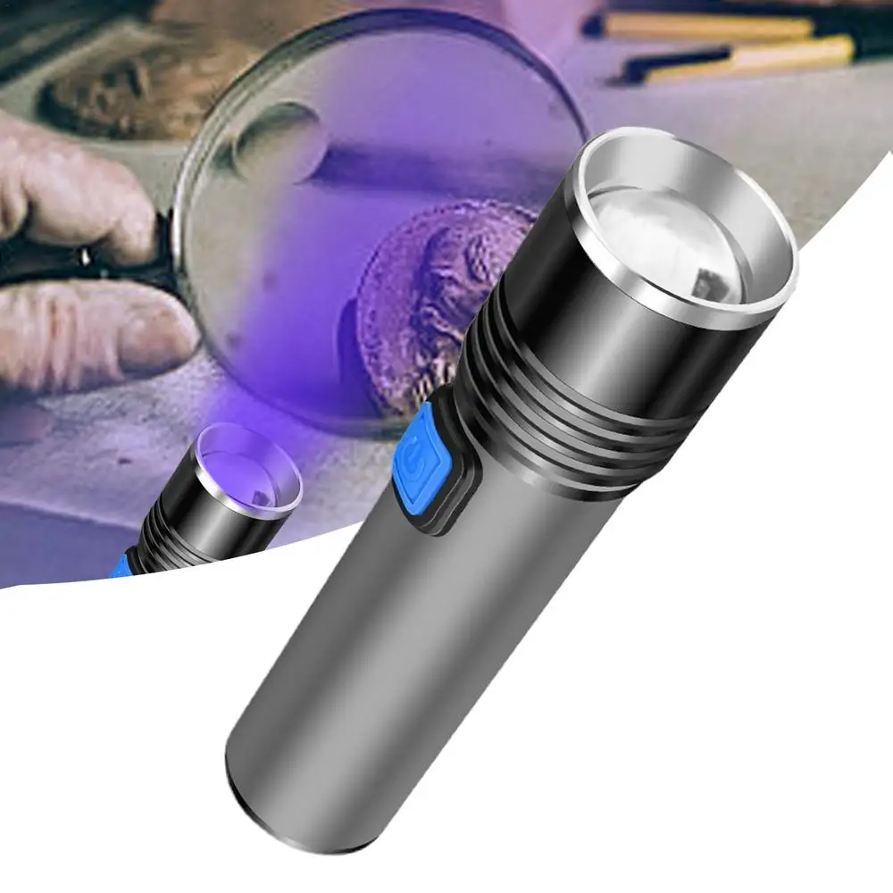 Detect concealed stains and counterfeit bills with our Black Light Flashlight! Zoom feature allows for thorough inspection of various surfaces such as pet urine and jade. Equipped with a rechargeable battery for long use. A must-have tool for home and business use.