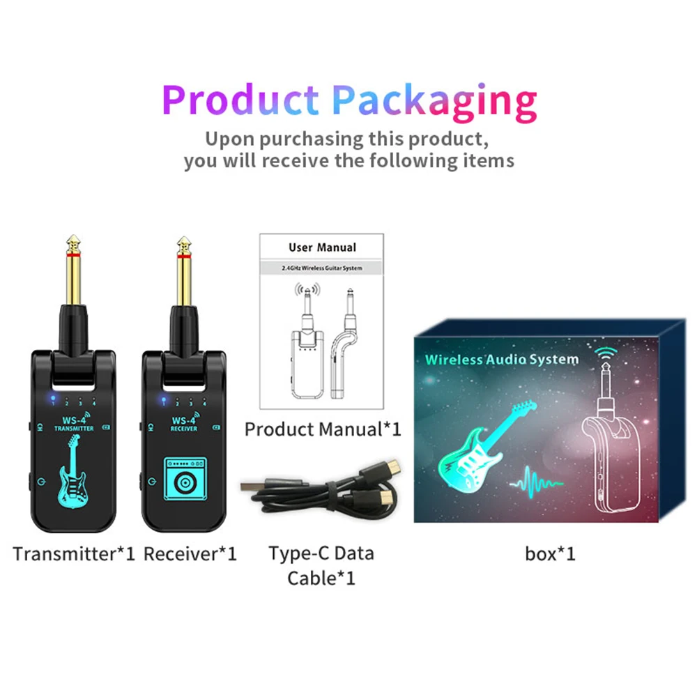 [Long battery life]: This 2.4G wireless guitar transmitter and receiver system has a large-capacity battery that can be used continuously for up to 10 hours. It comes with a Type-C dual-head charging cable that can charge the transmitter and receiver at the same time. It only takes 2 hours to fully charge.
