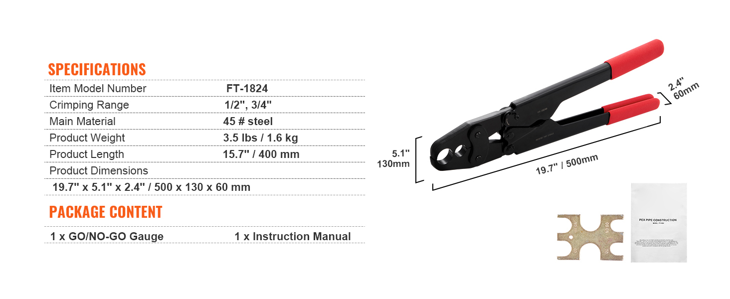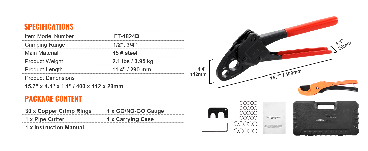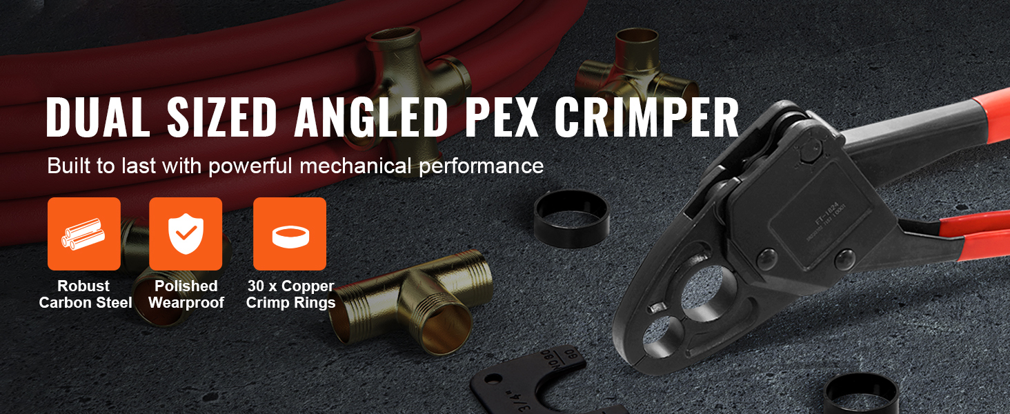 All-in-One Versatile Kit: SucceBuy 2-head PEX crimping tool kit is designed for crimping 1/2-inch and 3/4-inch copper crimp rings and copper fittings. The tool set includes: 1 x Angle PEX Crimping Tool, 1 x Pipe Cutter, 30 x Copper Crimp Rings, 1 x Carrying Case, 1 x Go/No-Go Gauge, 1 x Instruction Manual.