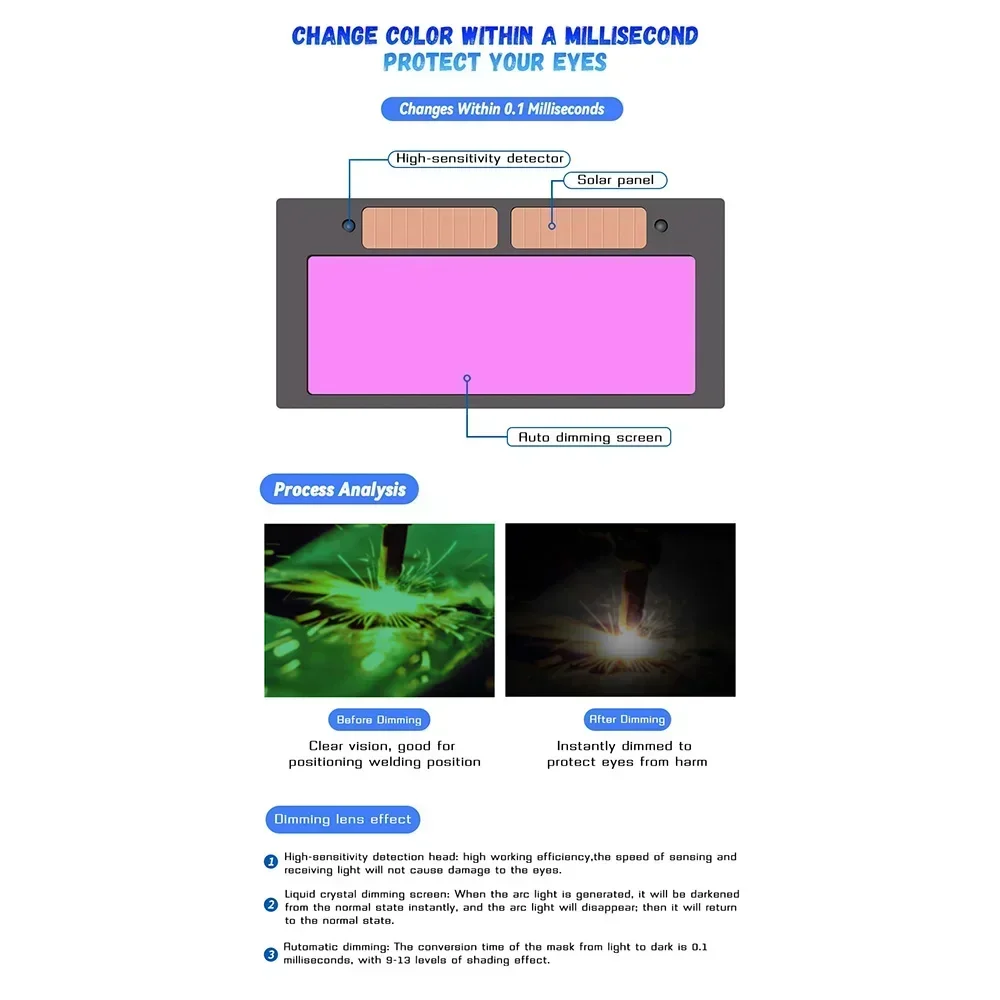 2. Automatic dimming welding mask, eye protection, high detection sensitivity, fast detection light change speed. The field of vision is very clear before darkening, and the welding position can be accurately positioned. When you dim, it immediately darkens, filtering harmful light and protecting your eyes from damage.