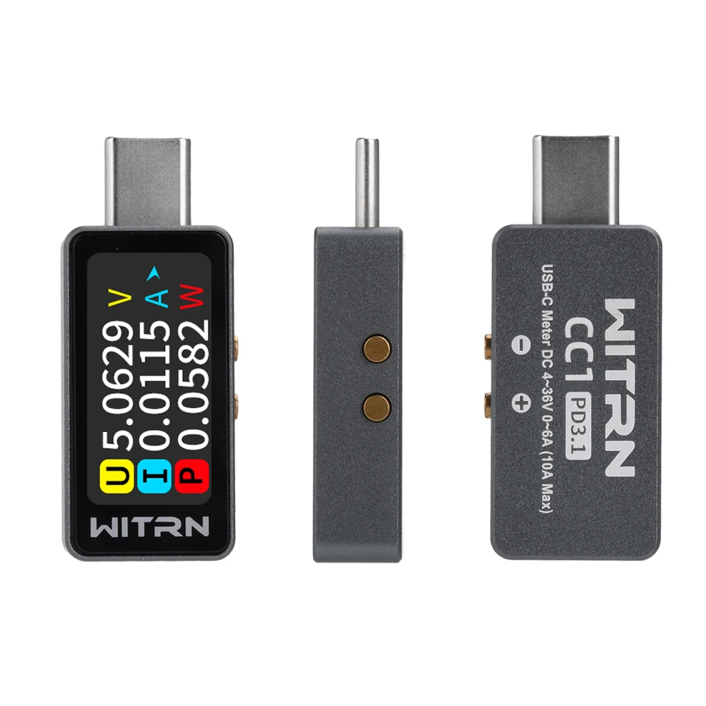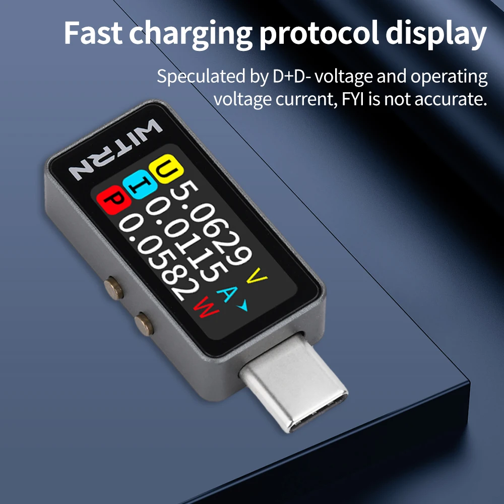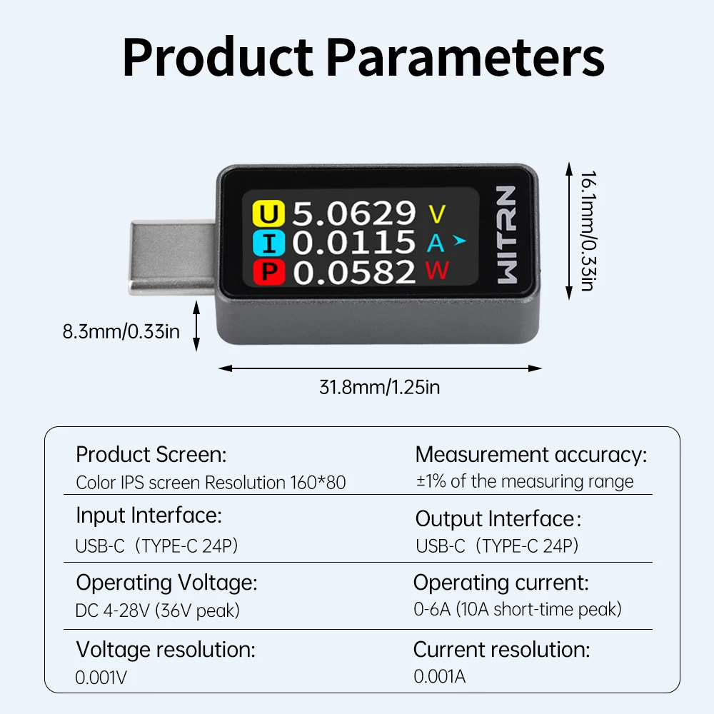 Parameter:Product Screen: Color IPS screen Resolution 160*80Input interface: USB-C (TYPE-C 24P)Output Interface: USB-C (TYPE-C 24P)Operating voltage: DC 4-28V (peak 36V)Operating current: 0-6A (short-time peak 10A)Voltage resolution: 0.001VCurrent resolution: 0.001ACapacity record: 0-9999WhMeasurement accuracy: range ± 1%Product size: about 31.8x16.1x8.1mm (not including Type-C male)