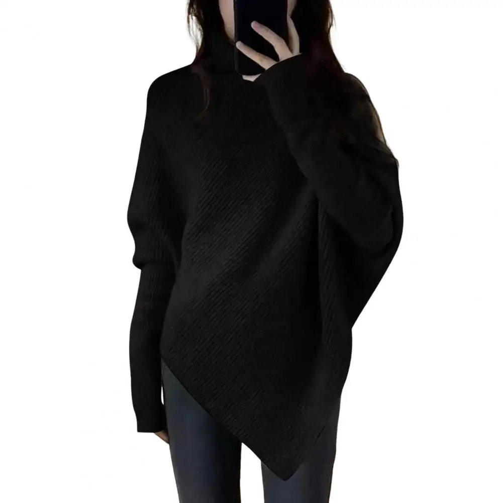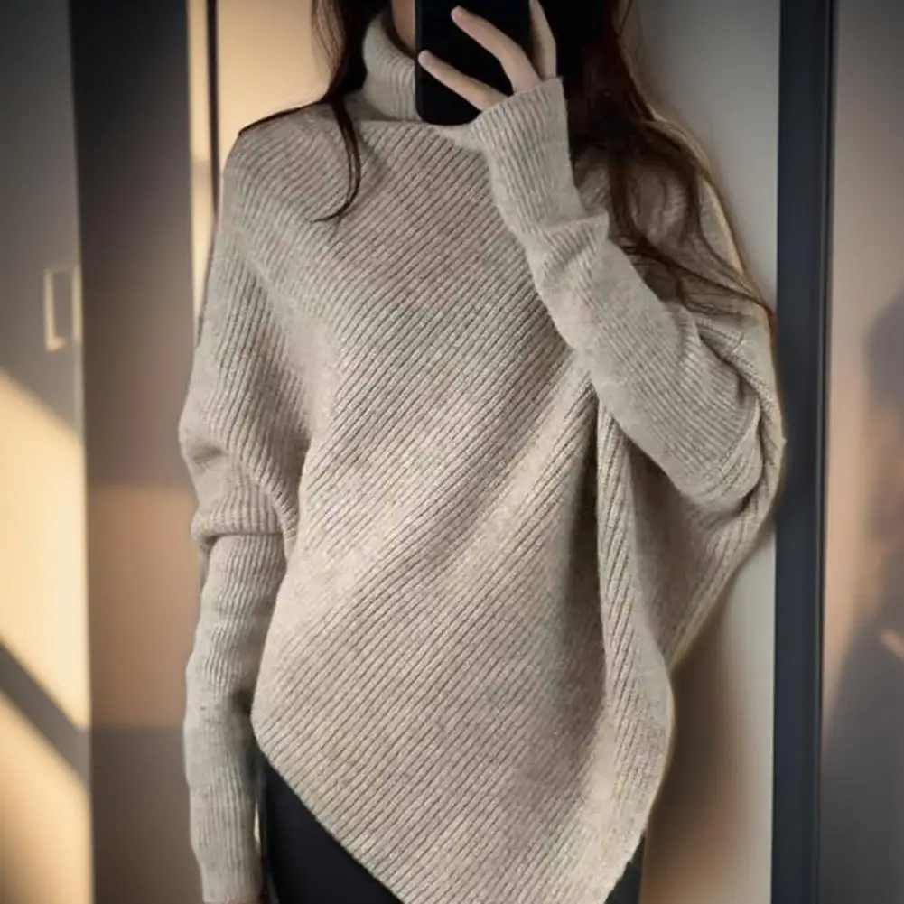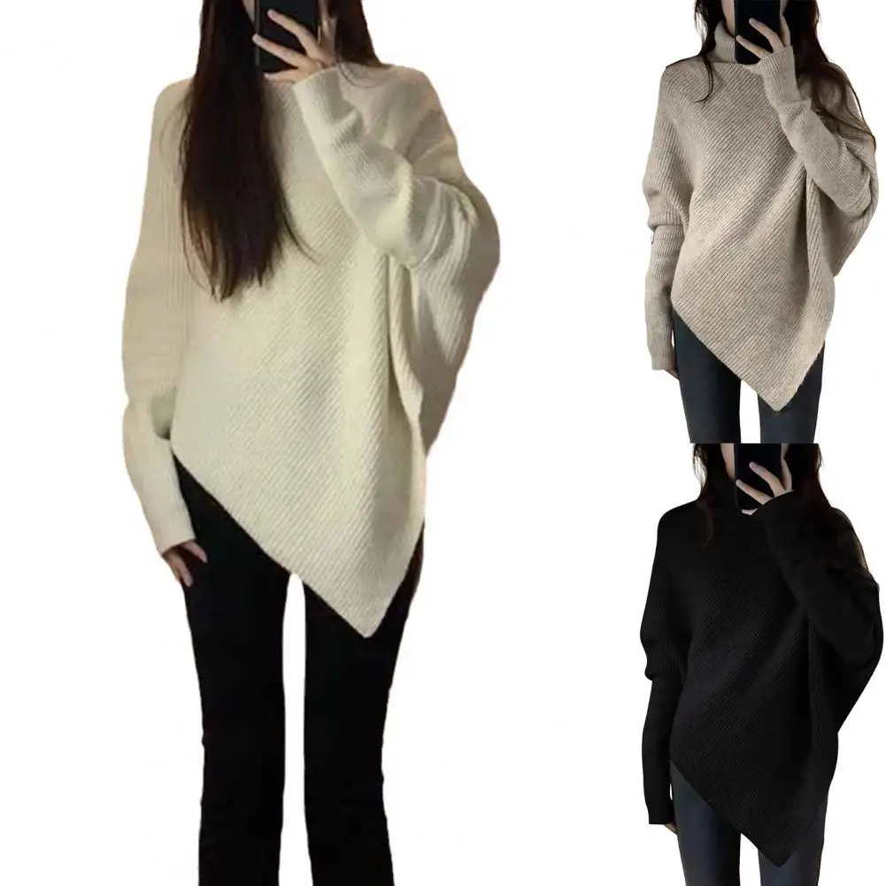 Women Fall Winter Sweater High Collar Solid Color Irregular Hem Bat Sleeve Thick Warm Soft Elastic Loose Pullover Long Sleeve Lady Cozy Sweater