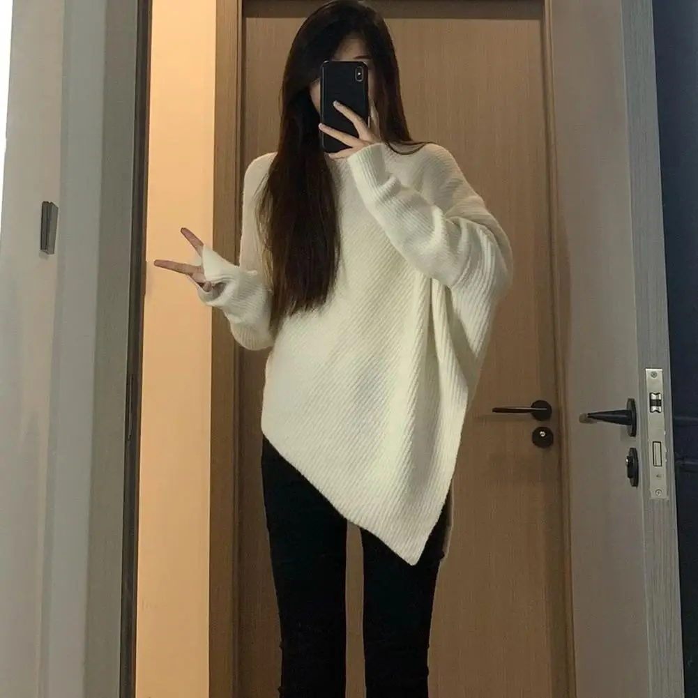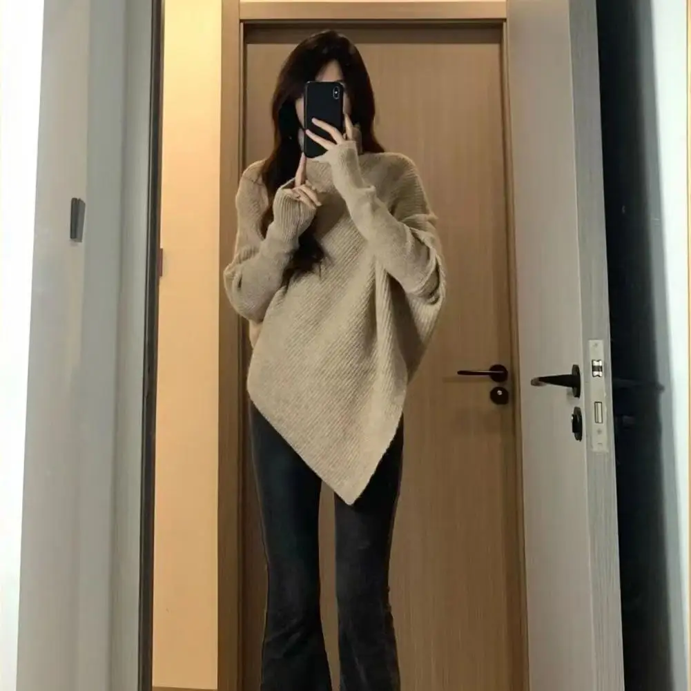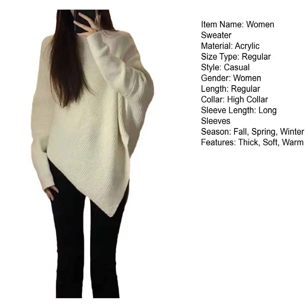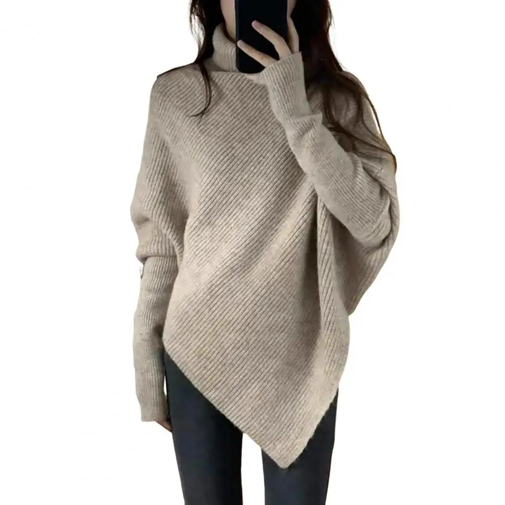 Women Fall Winter Sweater High Collar Solid Color Irregular Hem Bat Sleeve Thick Warm Soft Elastic Loose Pullover Long Sleeve Lady Cozy Sweater