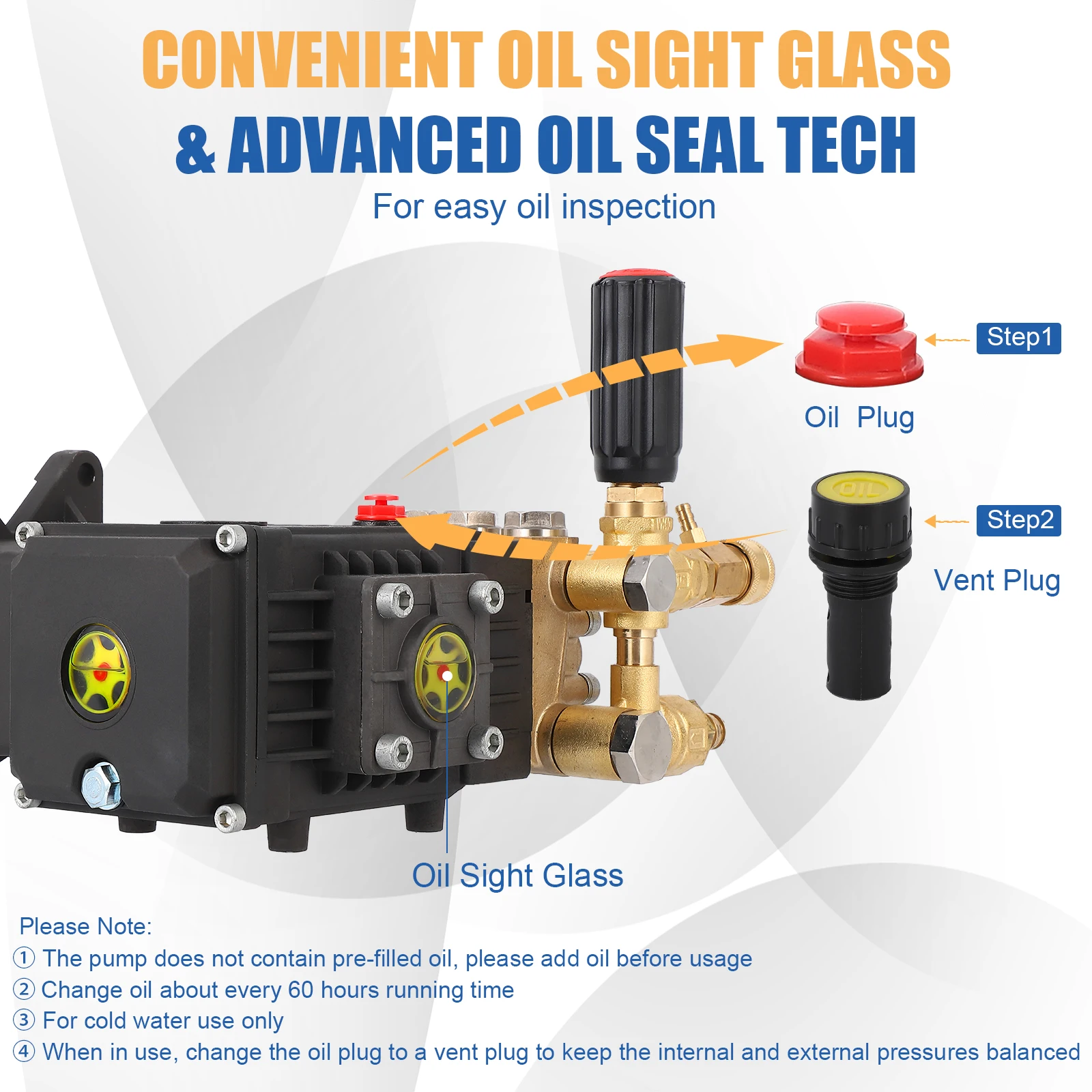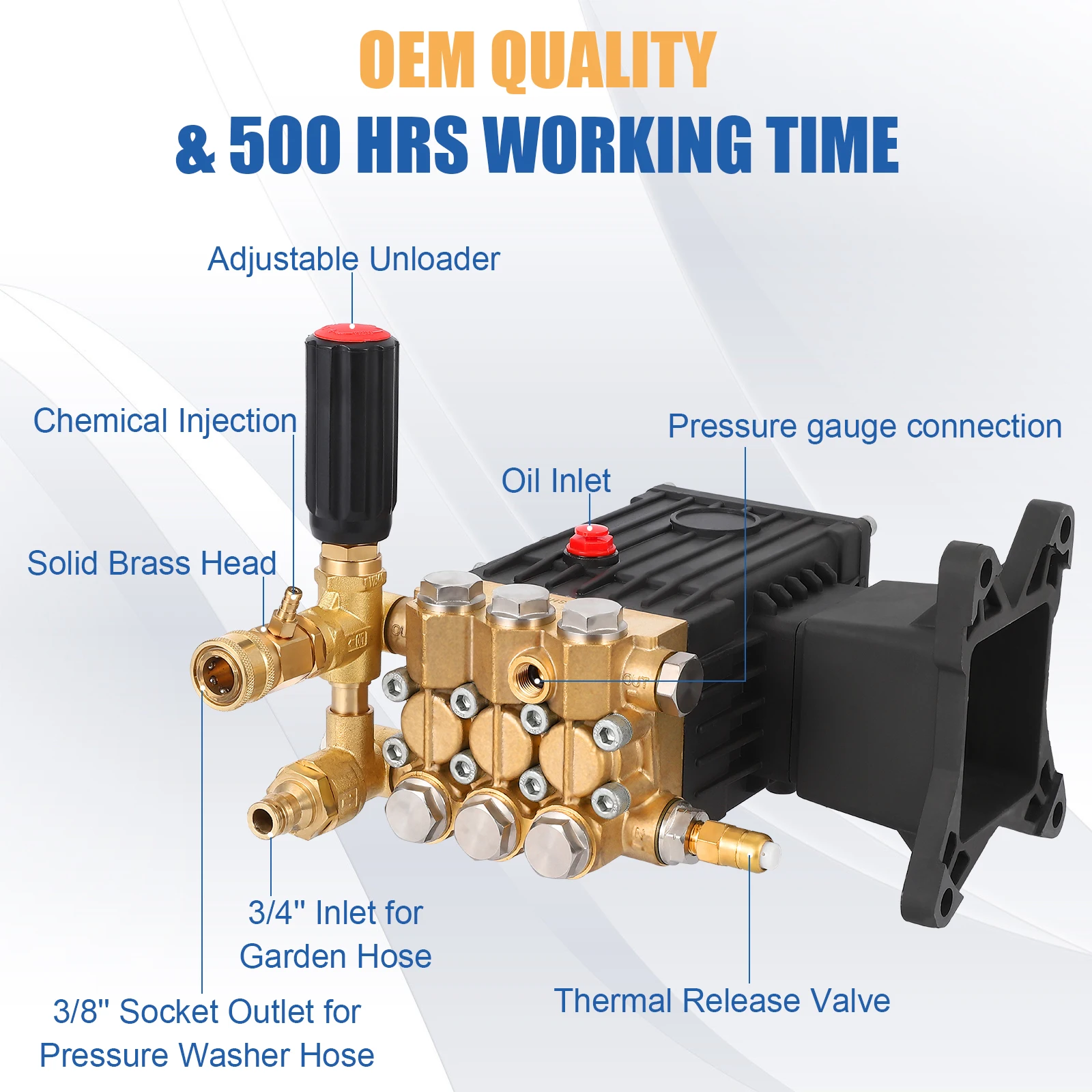 ???? [For Long-term Safe Use] This pump features a fully blackened crankcase, robust brass pump head and triplex plunger construction, improving sealing effectiveness, strength, longevity and durability. Also, our power washer pump features a built-in thermal relief valve. This important safety feature prevents overheating, ensuring the longevity of the pump's internal components