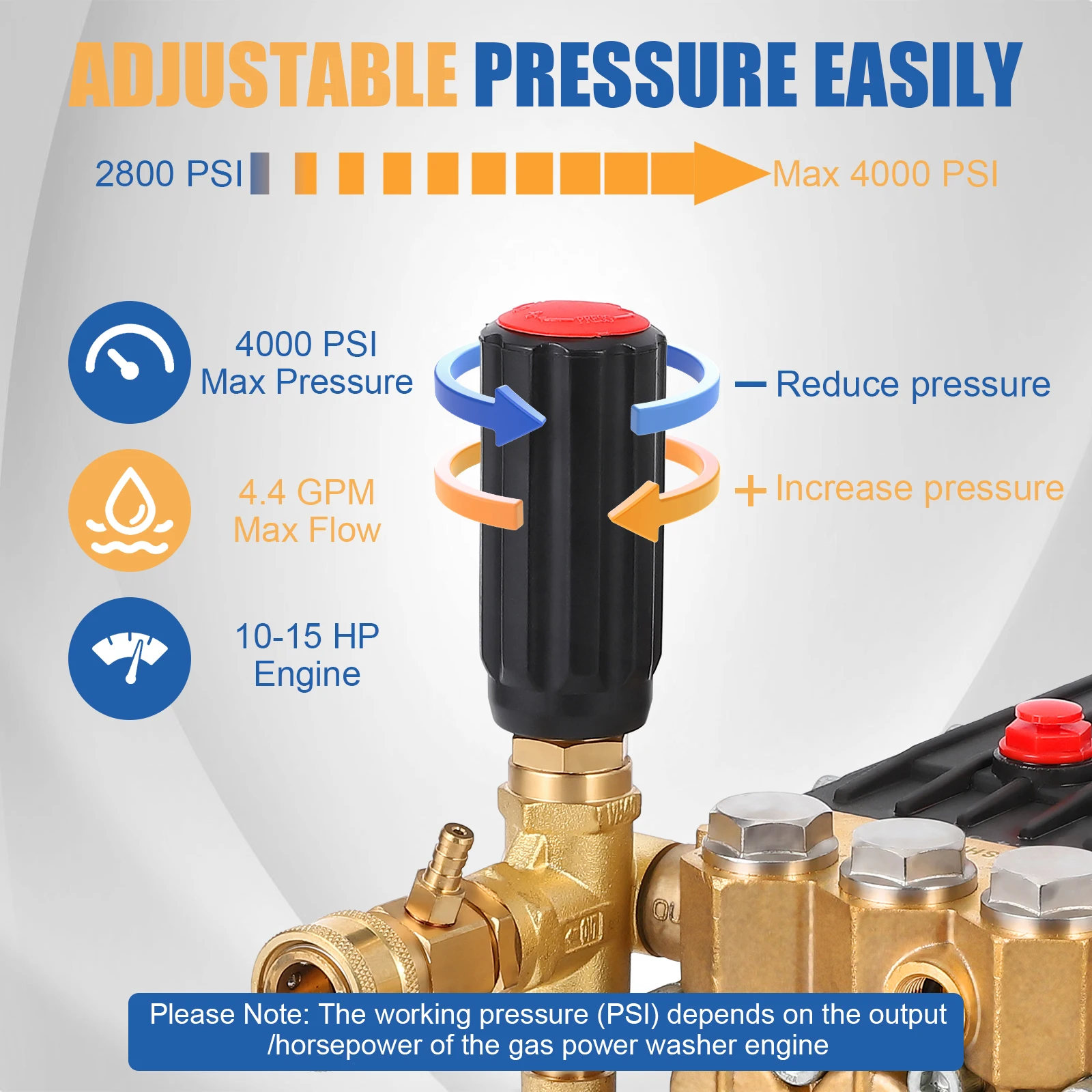 ???? [Adjustable Pressure for Various Cleaning Tasks] Equipped with an adjustable unloader, could adjust your pressure output to suit various cleaning tasks, thus increasing cleaning efficiency and protecting surfaces. Max up to 4000 PSI and 4.4 GPM. Meet your residential and commercial pressure washing demands for driveways, decks, fences, sidewalks, vehicles, and so on
