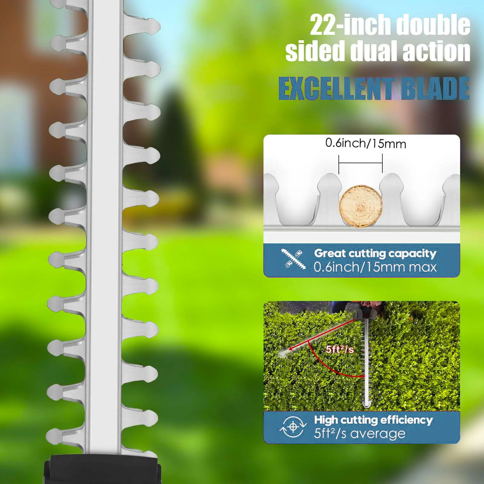 21V Cordless Hedge Trimmer 22 Inch Electric Hedge Trimmer with Battery & Charger with Dual Action Blade 3/5" Cut Capacity