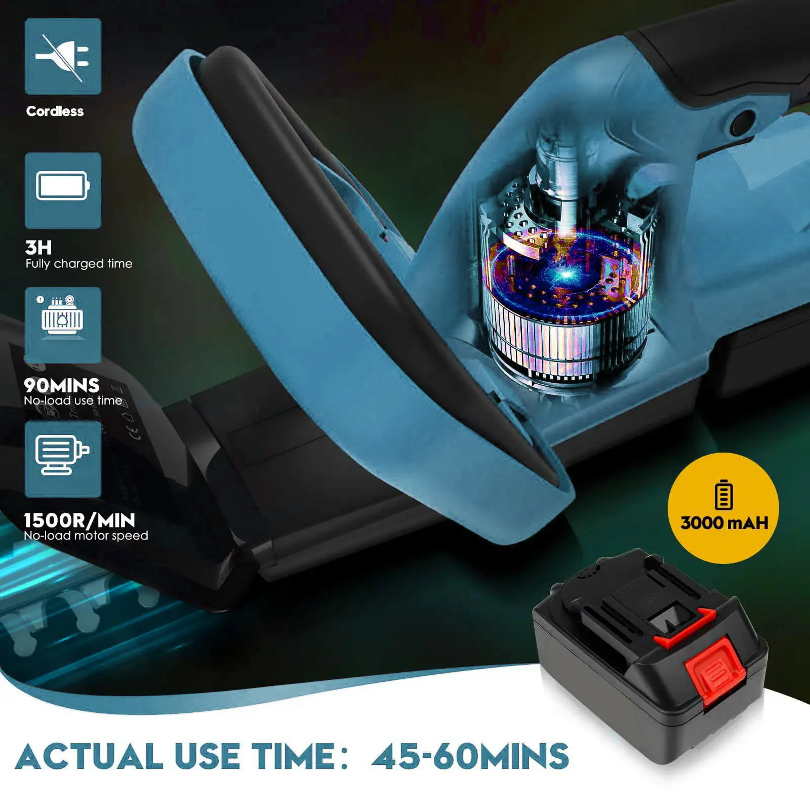 This wireless hedge trimmer comes with a battery and charger, and is equipped with hardened steel laser cutting blades for fast and smooth cutting. The 22 inch electric blade hedge trimmer is equipped with a powerful motor, with a no-load speed of up to 1500rpm, which can quickly take care of large areas. The battery powered hedge trimmer greatly improves overall work efficiency.
