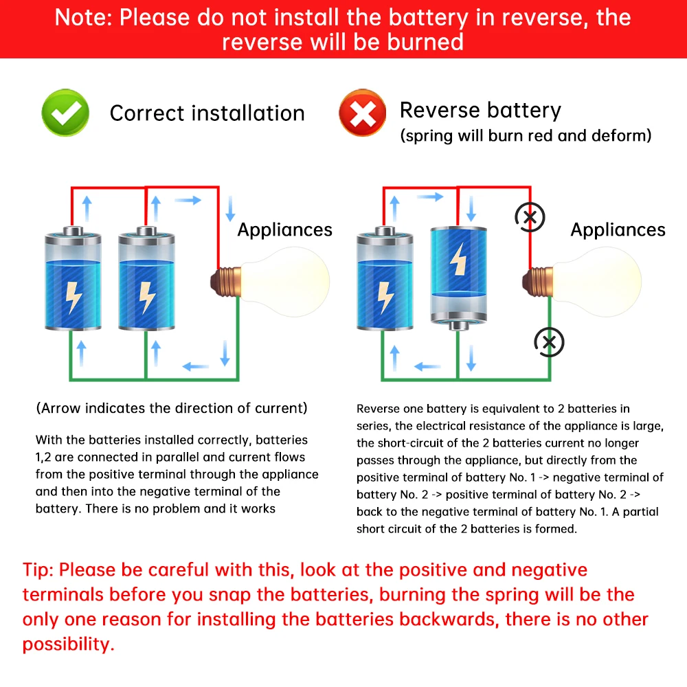 3.This product can only use flat 18650 batteries, pointed batteries longer than 2MM, can not be used!