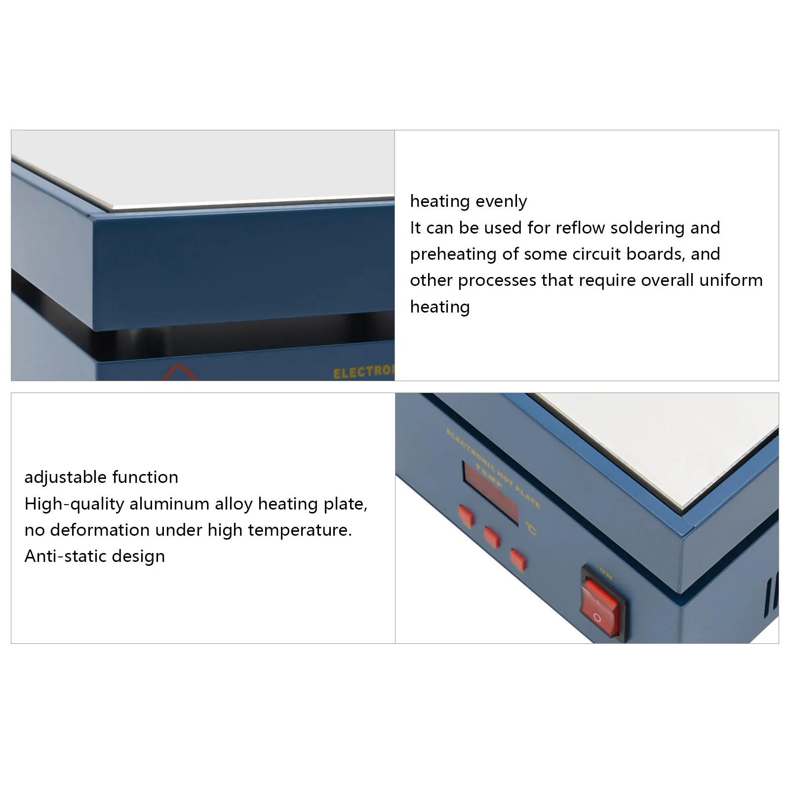 This product can be used for reflow soldering and preheating of some circuit boards and other processes that require overall uniform heating. It can be used for splitting, repairing cell phone screens, LED displays, component work, PCB dismantling, soldering work, component heating work, SMD rebuilding work (demolition, welding applicable temperature: 428~500℉), packaging box plastic sealing hot film work, etc. and widely used in biology, electronics industry, medical research work.