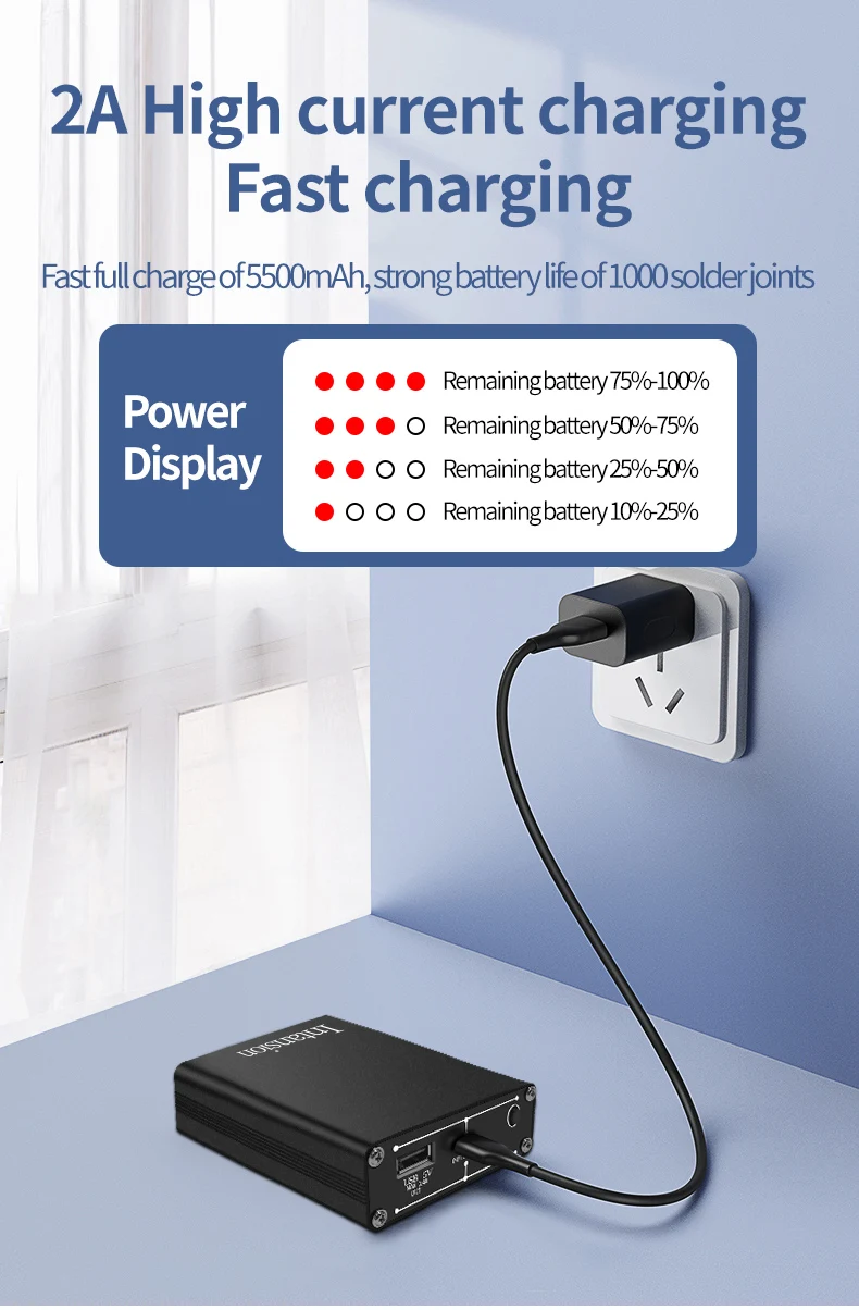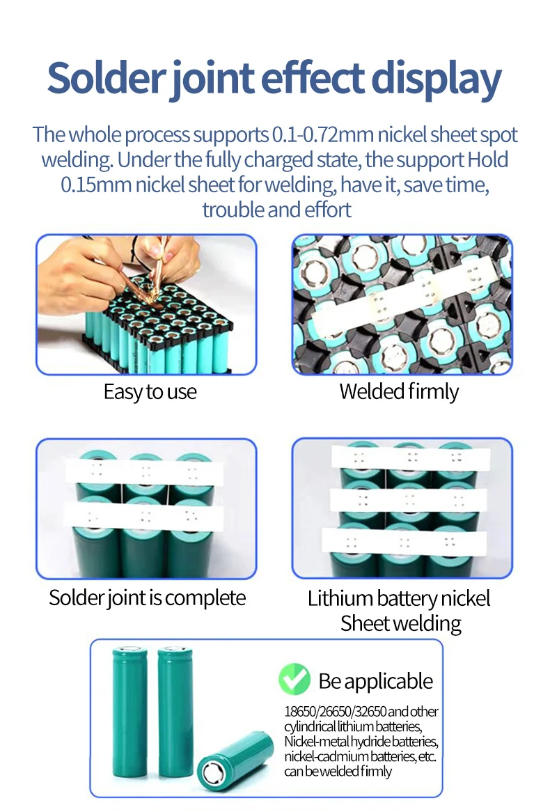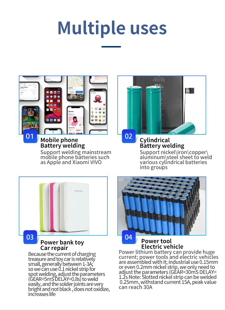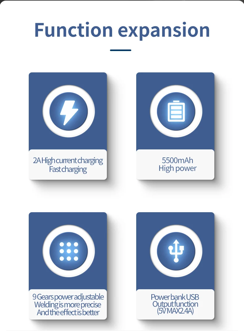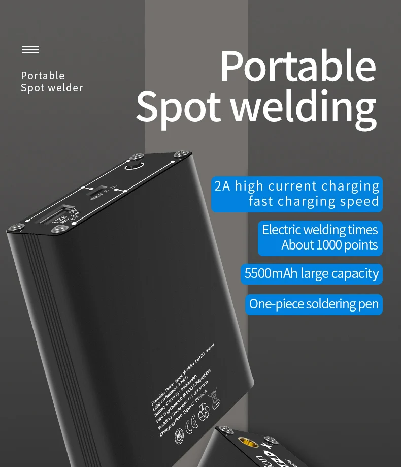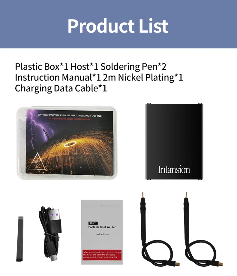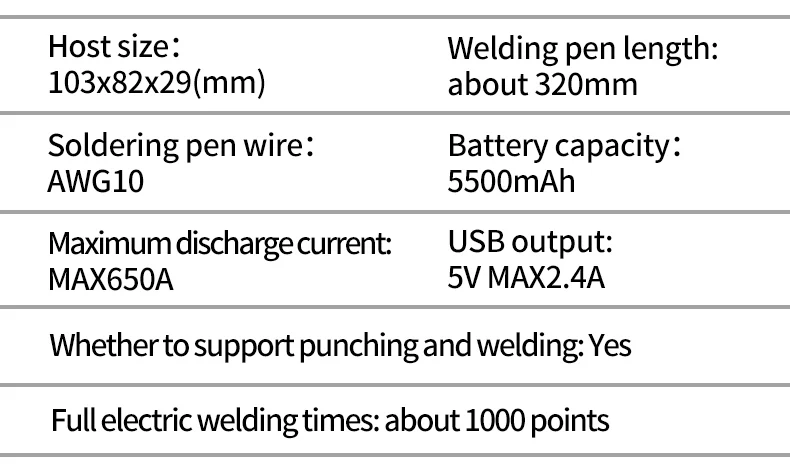 Specifications:Name: Spot Welding MachineMaterial: Metal CaseBattery Capacity: 5500mAhWelding Output: 4.2V MAX 650AUSB Output:5V MAX 2.4ACharging Port: USB-CProduct Weight: 302gProduct Size: 103x83x29mmPackage size: 143x107x48mmPackage weight: 407gHow to Use:*Take note to fully charge the battery before use*1. To Turn On/Off - Long press button for 3 seconds then release the button after hearing the boot sound,that is turn on/off.2. Short press the button. If the buzzer rings, that is shift position. Press one time, and it can add 1 gear. 1-9 cycles, and the 9th gear is the strongest welding strength.3. Soldering Operation - Start with level 1, unit will start soldering after 0.5 seconds once it detects item. Power setting can be adjusted to suit different soldering job. If high level going into current protection mode and reboot,you can connect a USB input;4. Auto Power Off - After no activity for 15 minutes the unit will automatically shut down.5. USB Output - The USB output will be activated automatically once connected. Once output current is less than 50mAh the unit will automatically cut power output. Short press button to resume power output.6. Error Warning - If the device fails, the buzzer keeps beeping after turning on;7. Firmware Update - The upgrade port is reserved, which can be upgraded to the latest firmwarePackage Included:1 x DH20 Pro+ Welding Machine1 x Welding Pen1 x 0.12mm*8mm*2m Nickel Plated Steel Belt