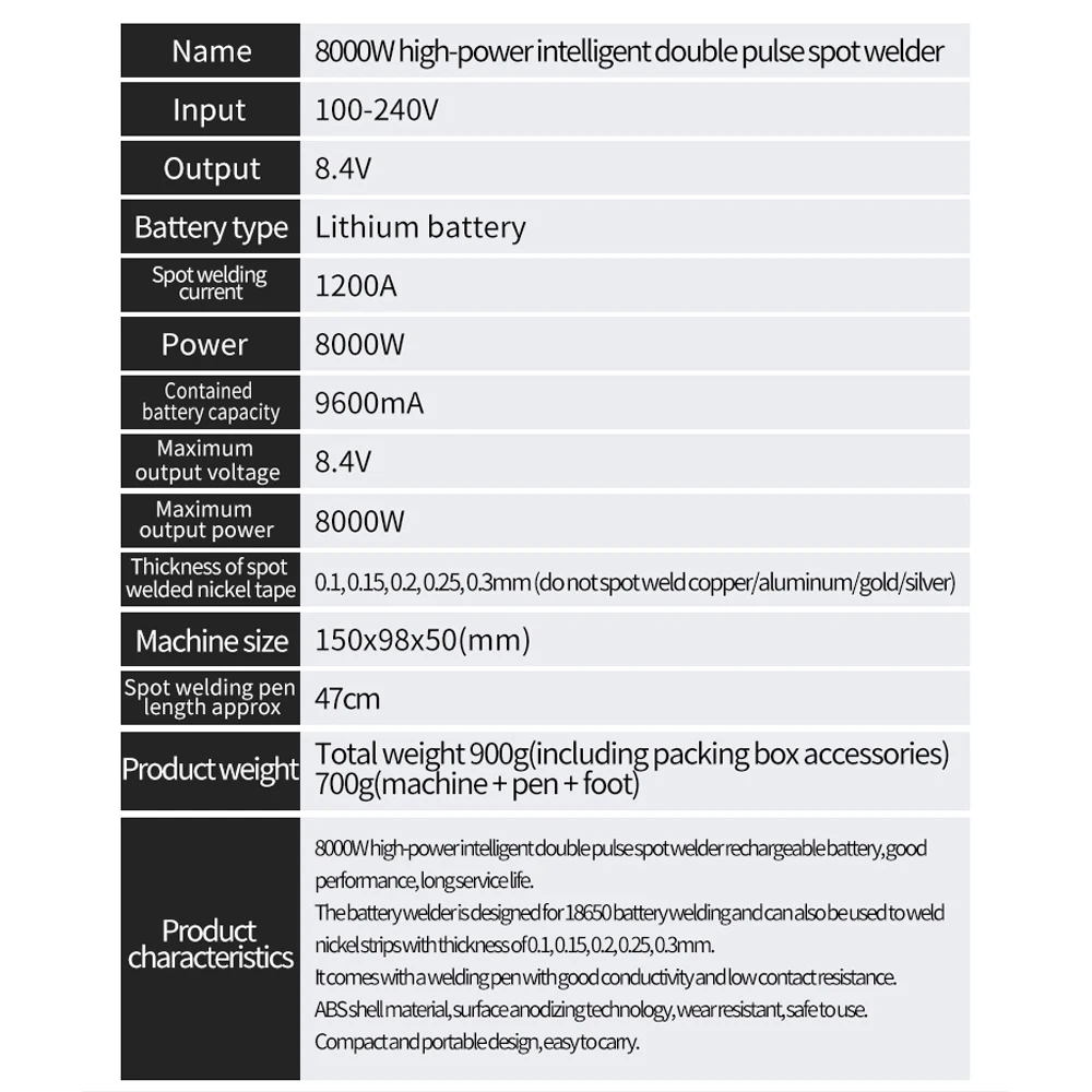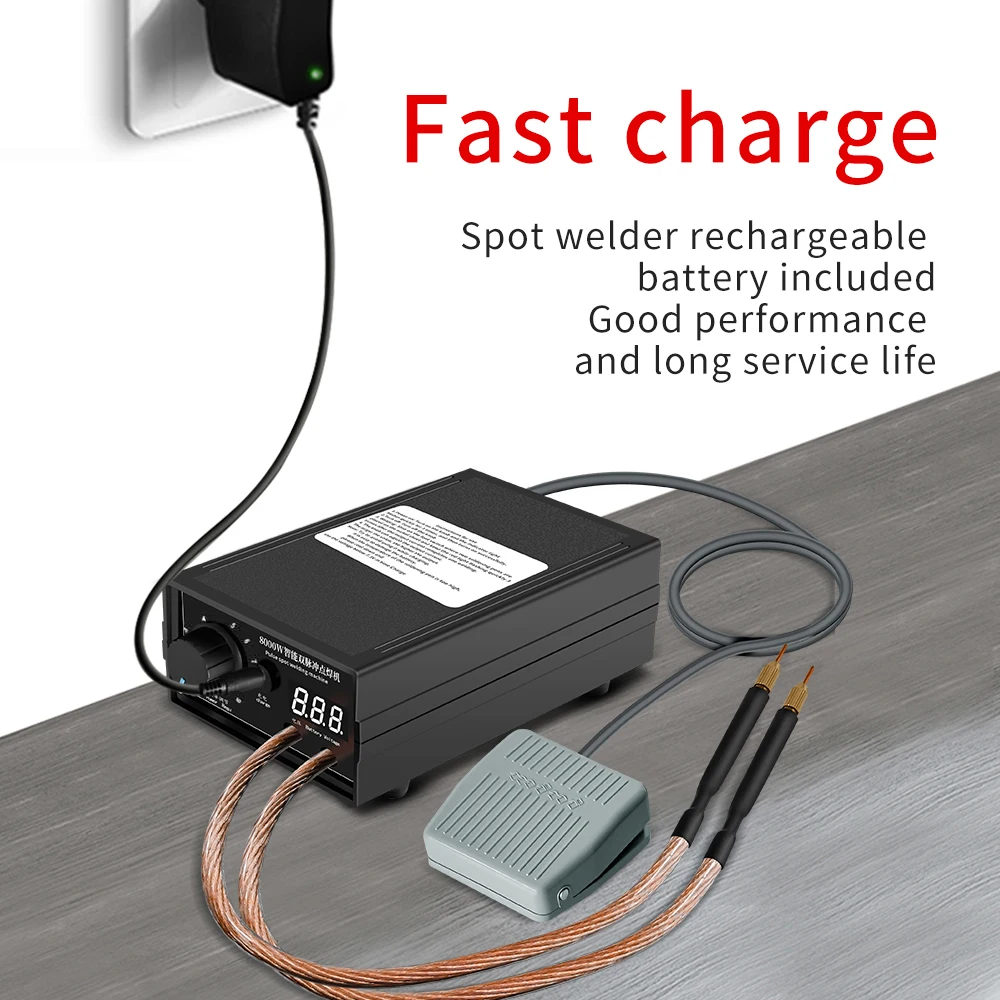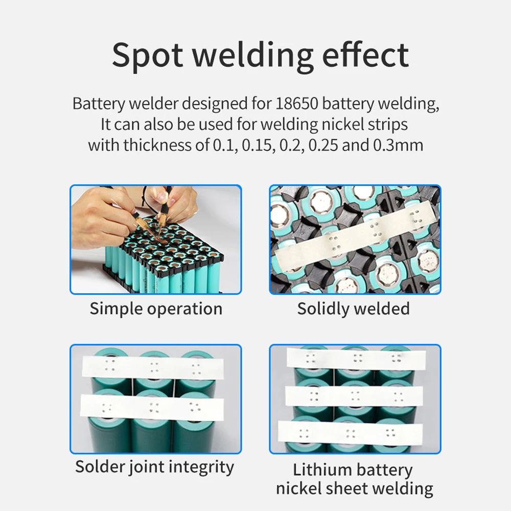 The welding process is based on the principle of high current and high temperature, rapidly melting part of the nickel sheet, and cooling. This spots welding machine is 8000W high power design, output power adjustable for more accurate welding, suitable for continuously welding thousands of points on nickel/nickel-plate sheet. It supports welding 0.1-0.3mm nickel sheets with solid and beautiful welding spots. This product can be widely used on spots welding lithium battery lithium batteries, cellphone batteries, and can be soldered firmly.