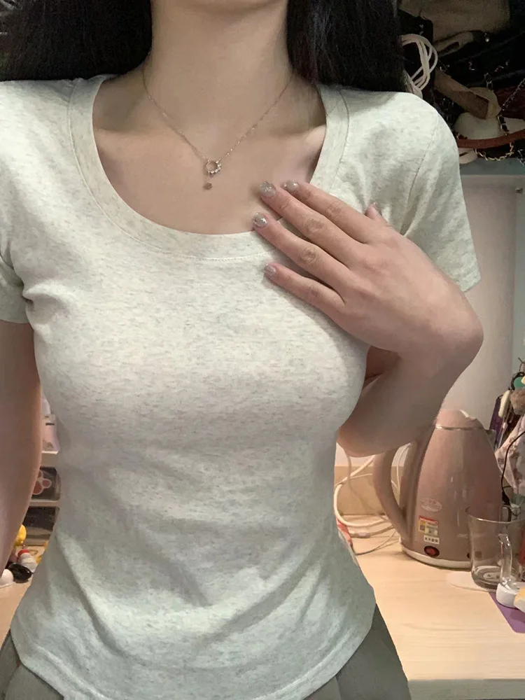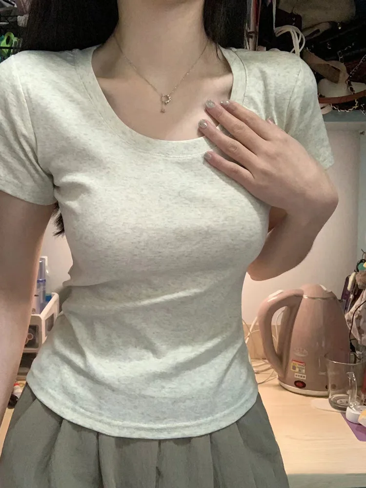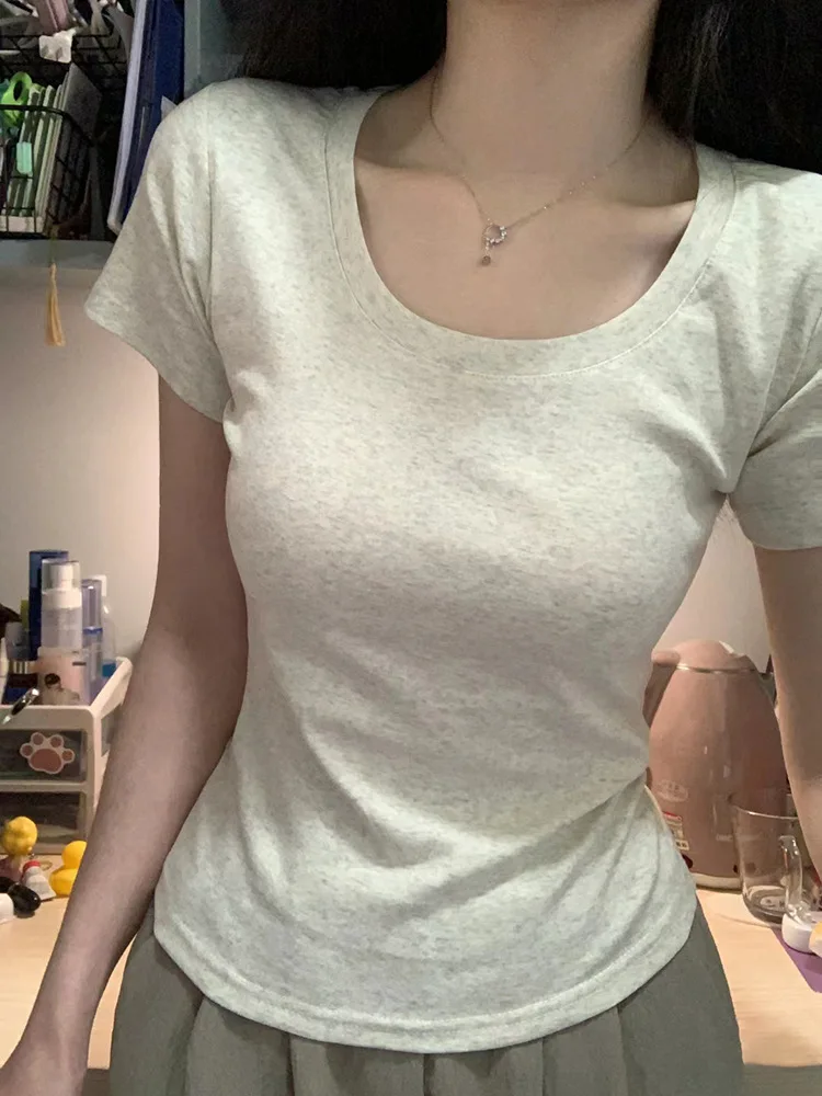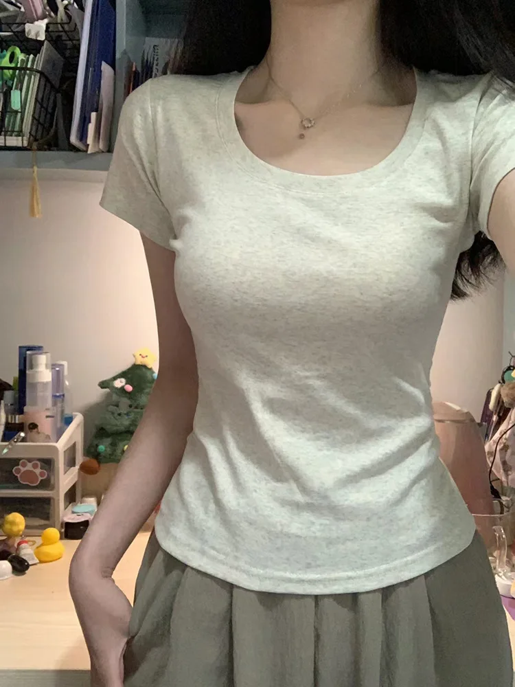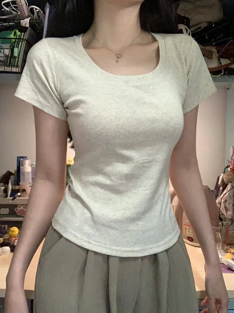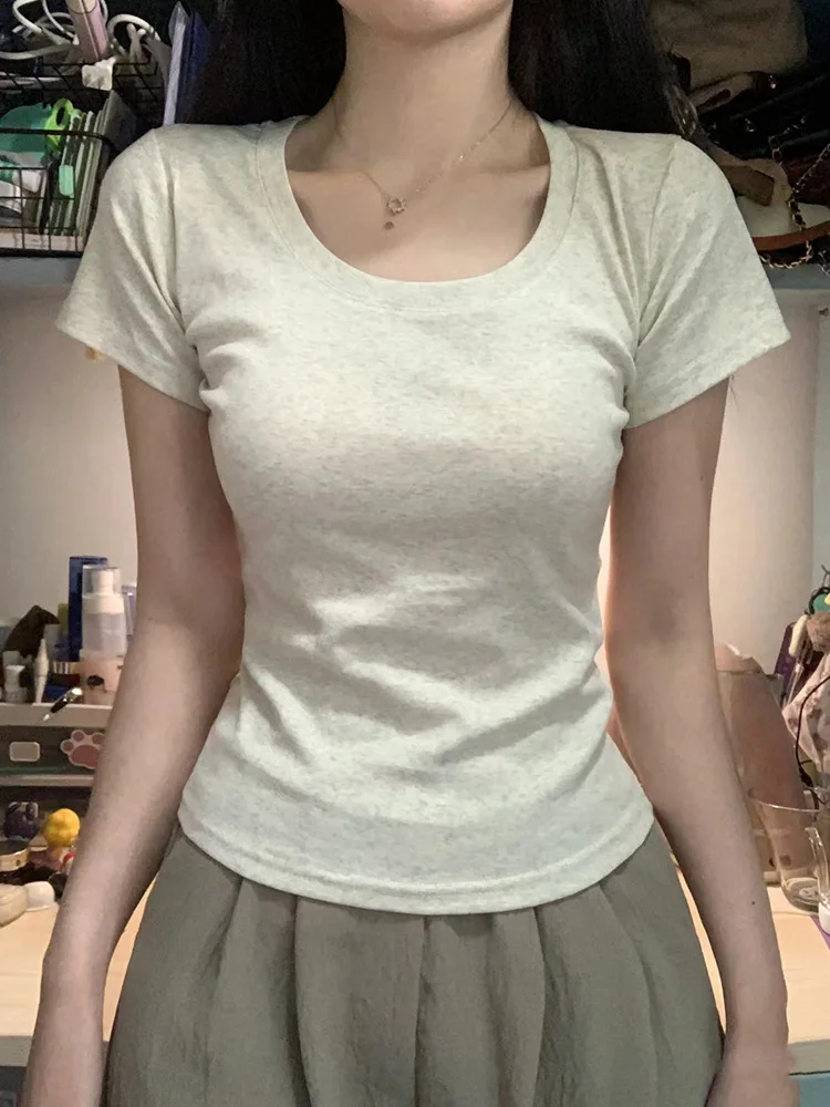 2025 Summer High Quality Slim T shirt Sexy Short Sleeves Round Neck Tops Fashion Trend Solid Women Clothing y2k Tops