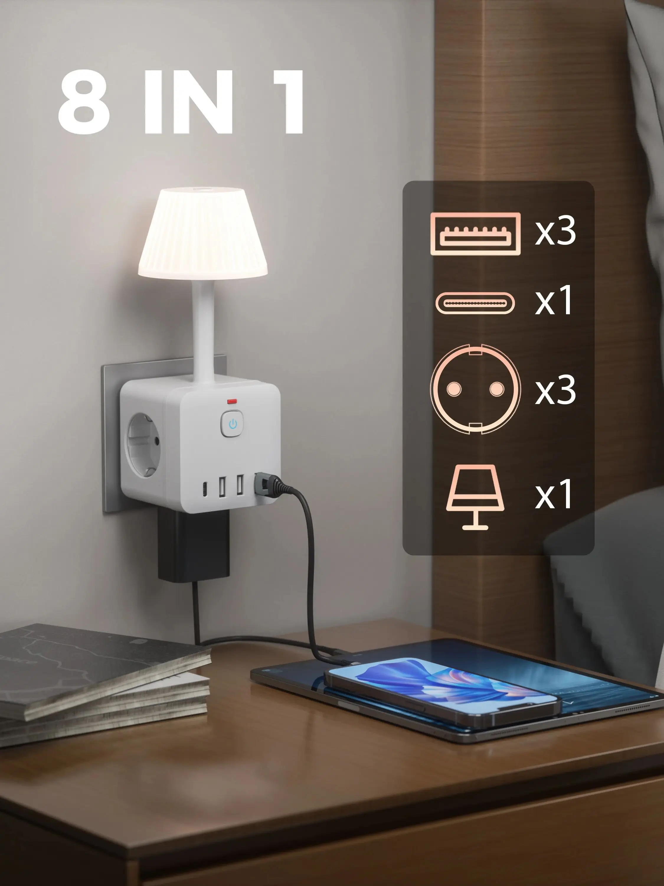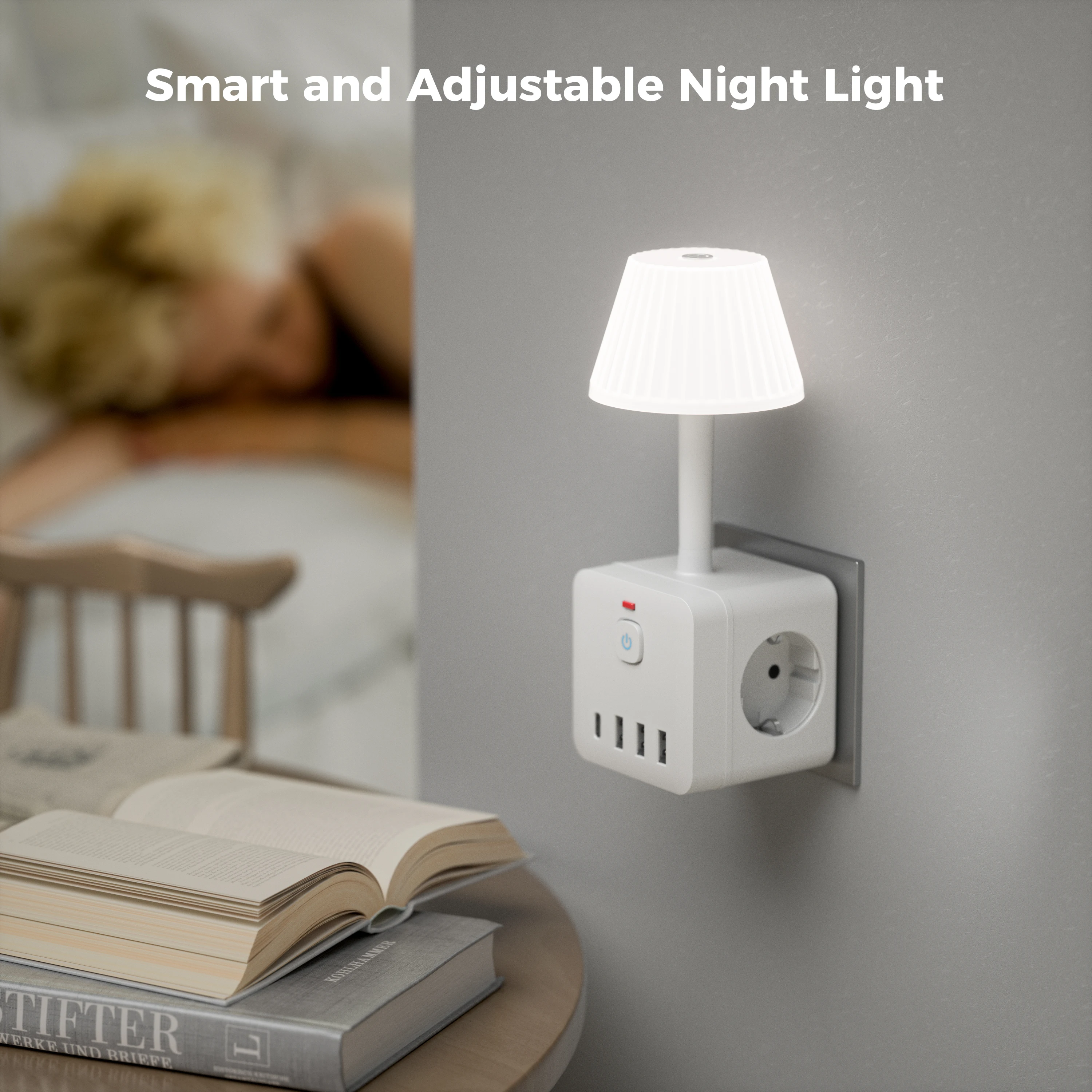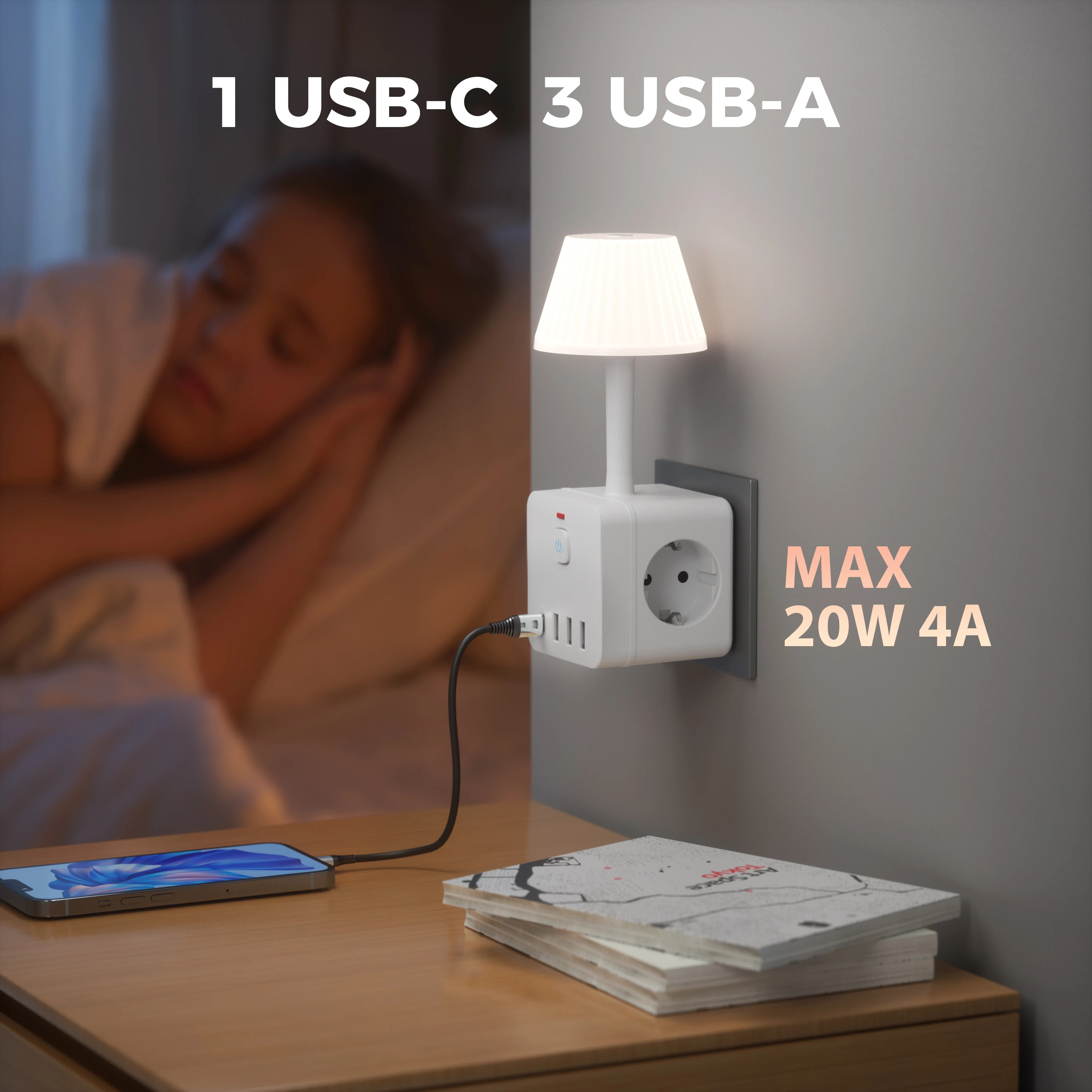 8-in-1 Output Power Outlet with Overload Protection with Desk Lamp, 3 Receptacles, 3 USB Ports, 1 Type-C Port, and Switch; for h