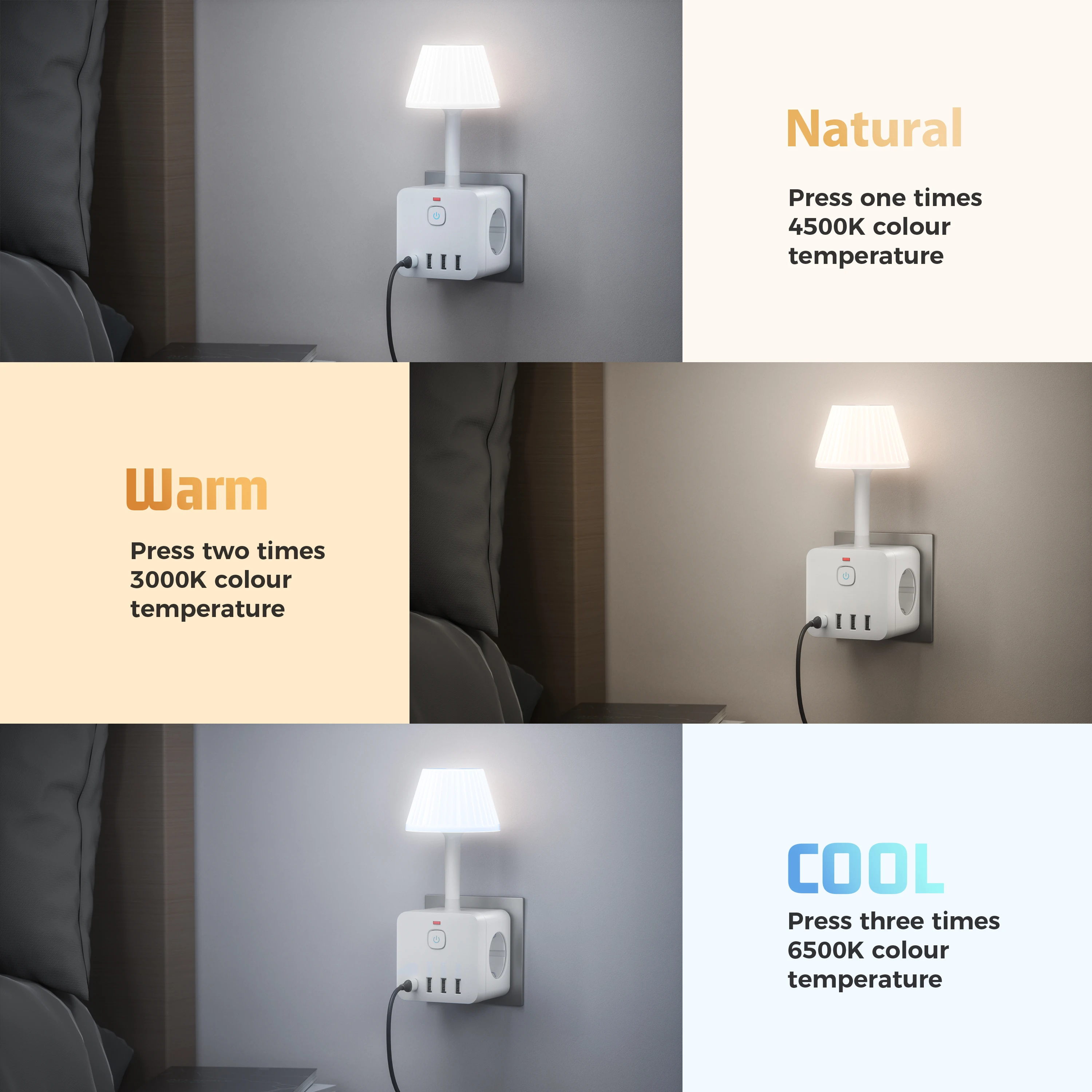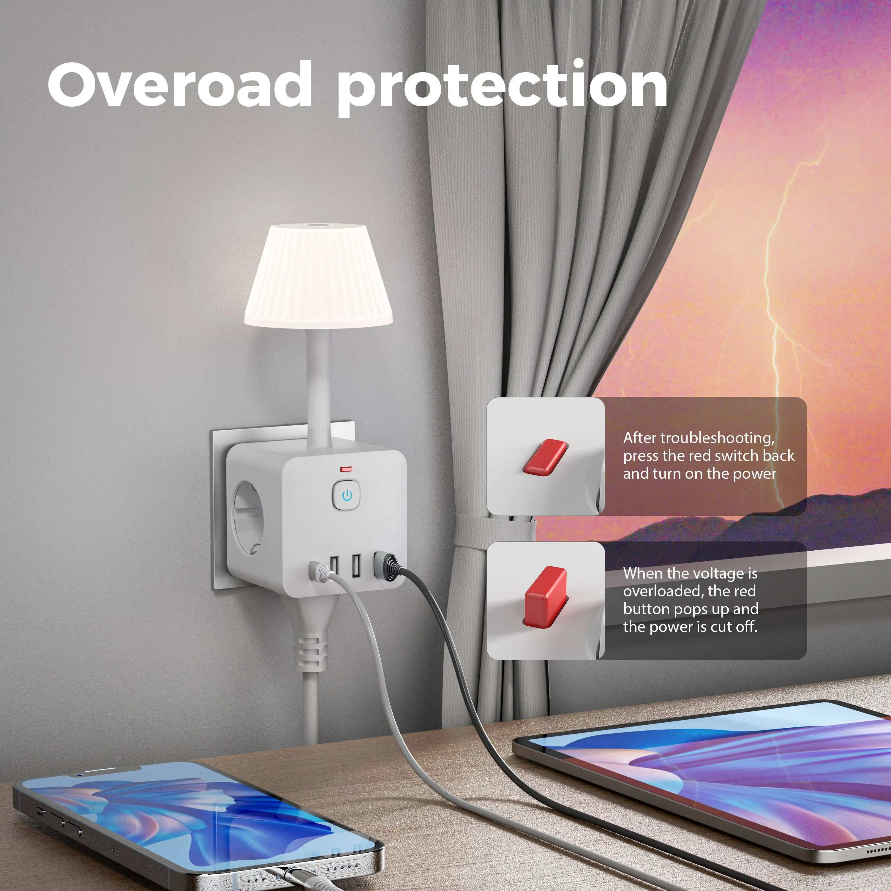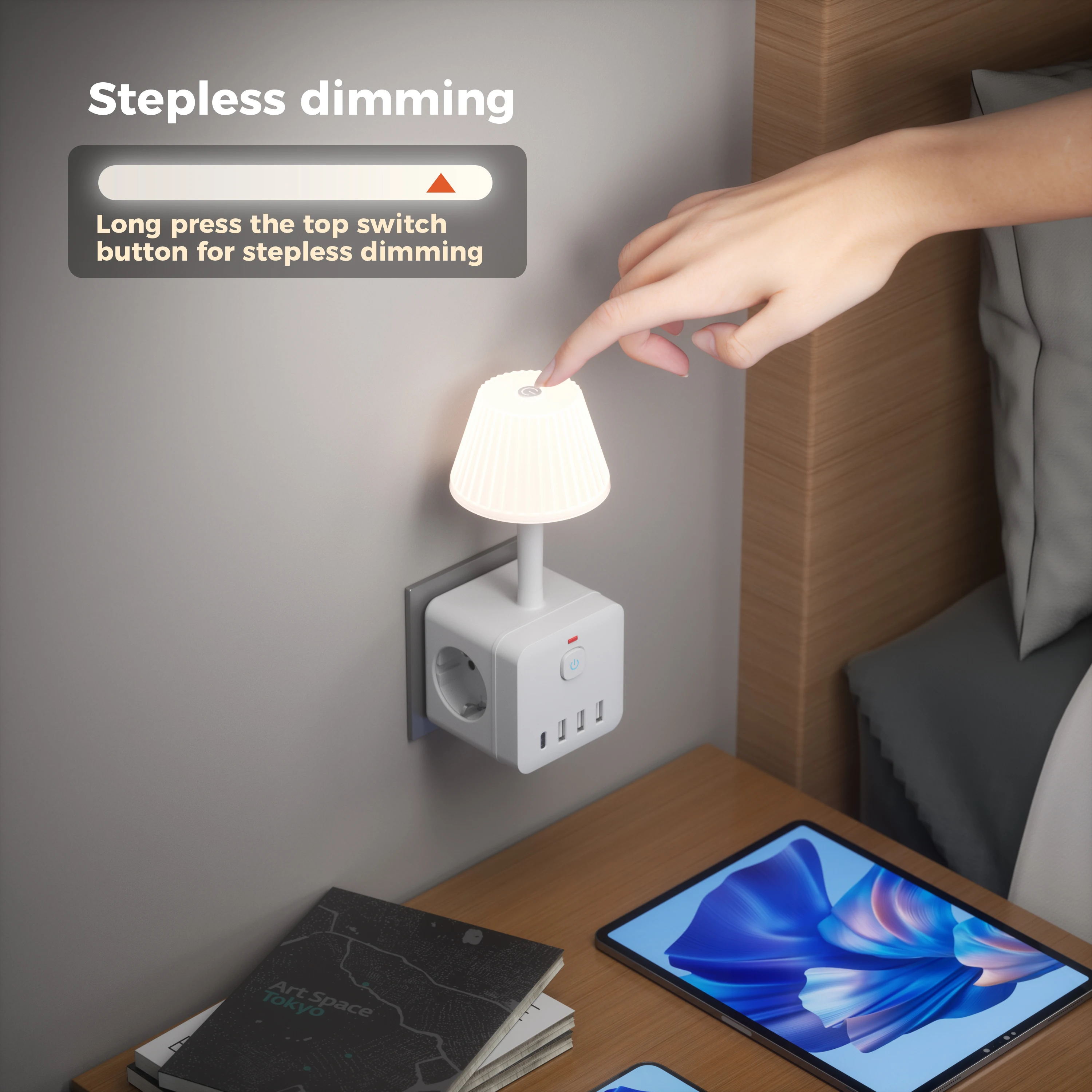 8-in-1 Output Power Outlet with Overload Protection with Desk Lamp, 3 Receptacles, 3 USB Ports, 1 Type-C Port, and Switch; for h