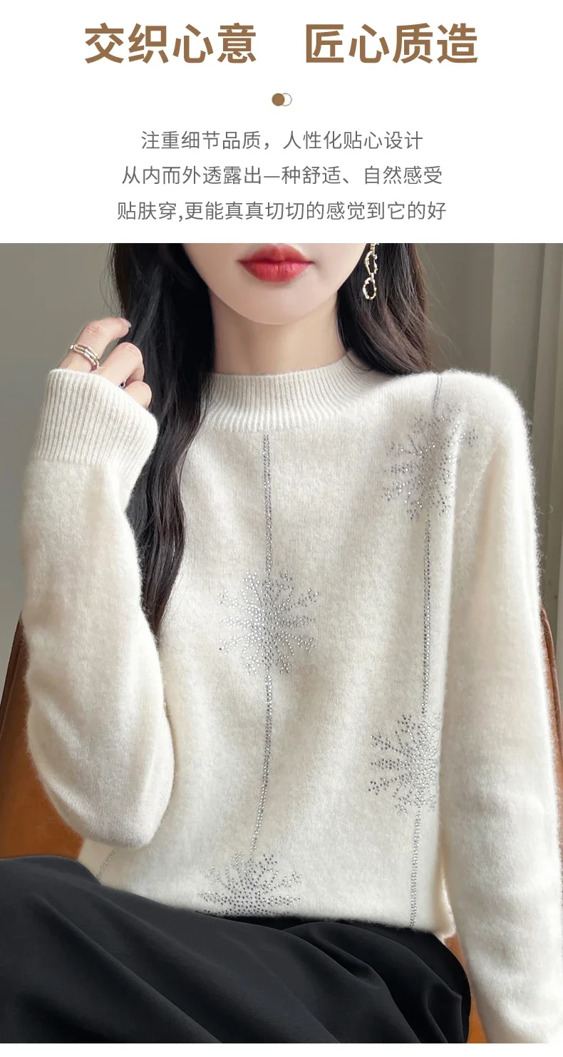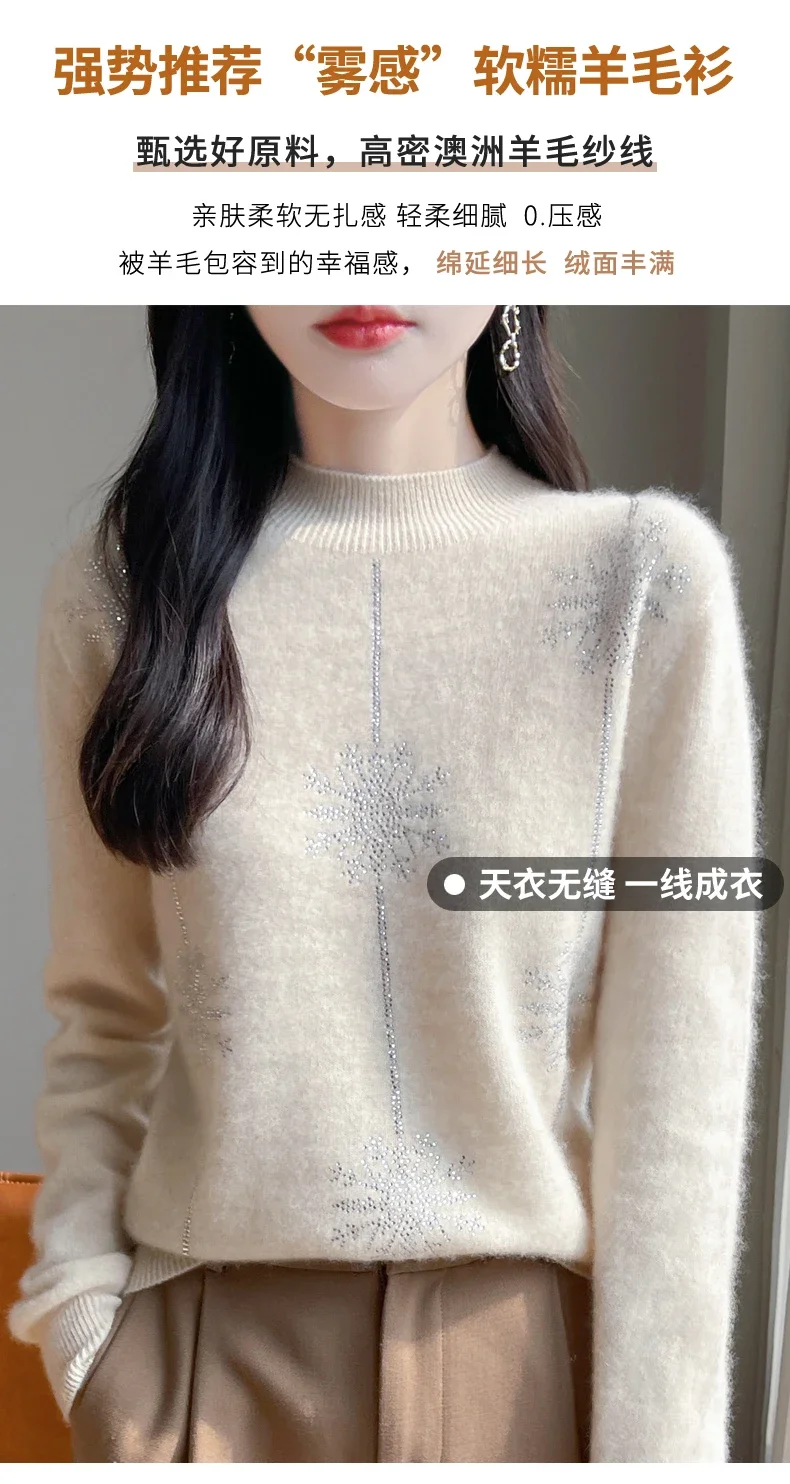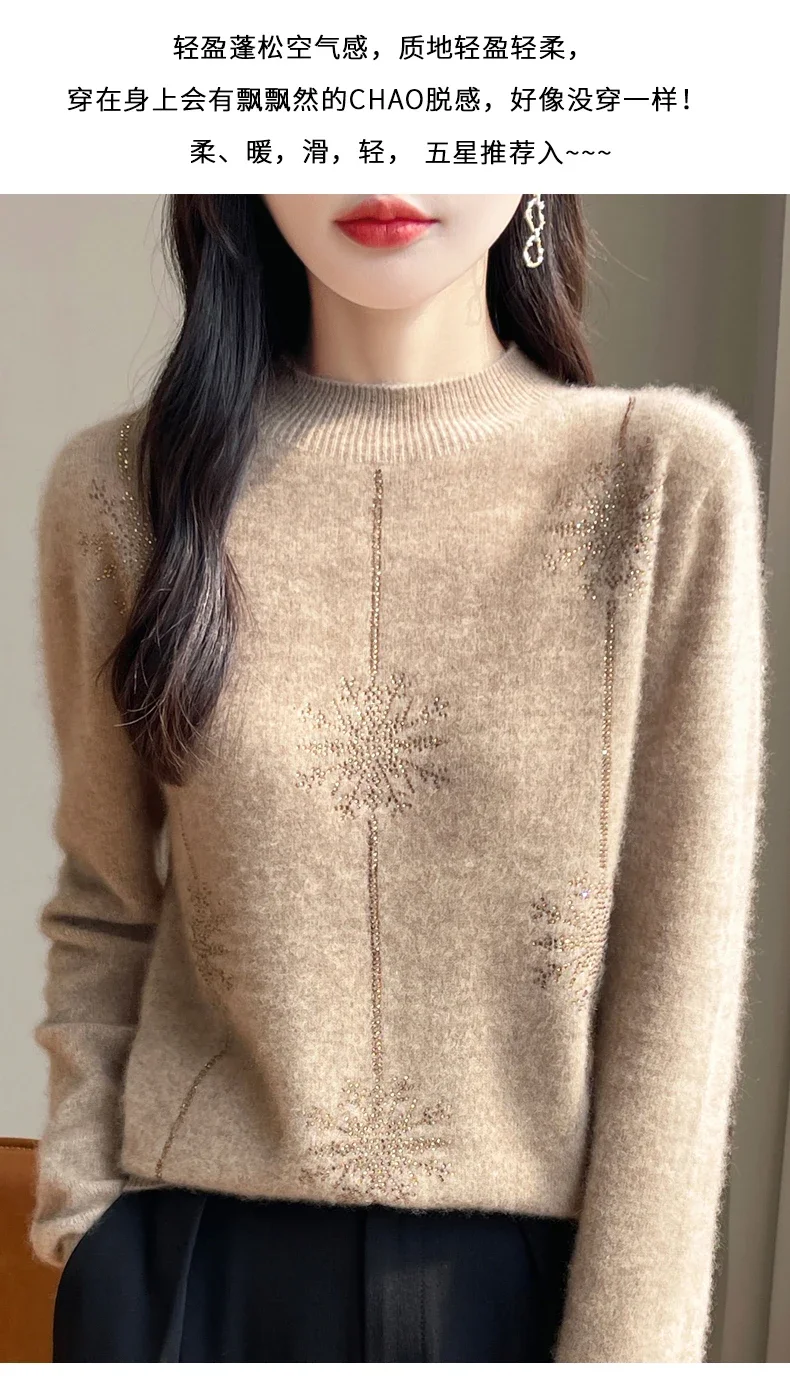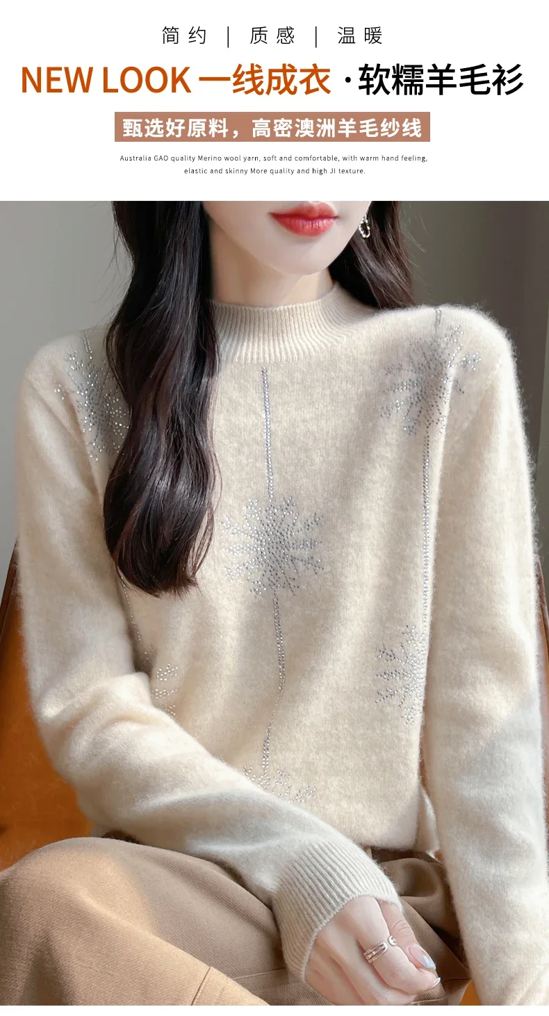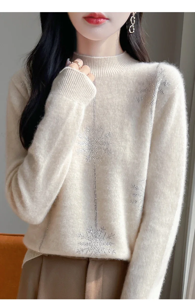 Diamond 100% Wool Sweater 2025 New Women's Fashion Autumn/Winter Warm Hoodie Elegant Half High Collar Jumper Knitted Top