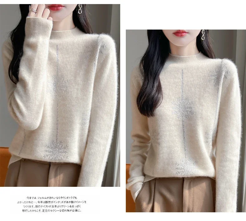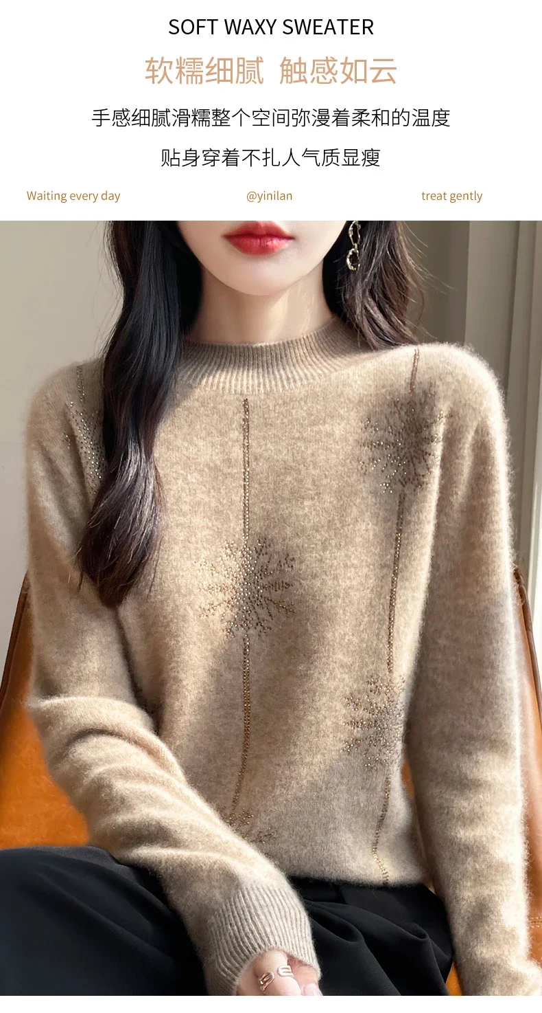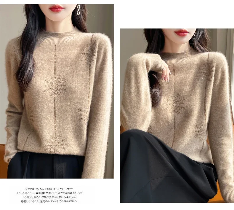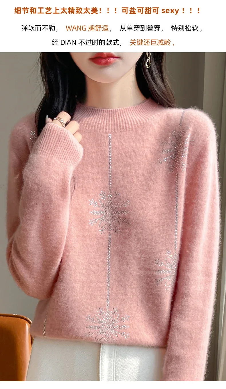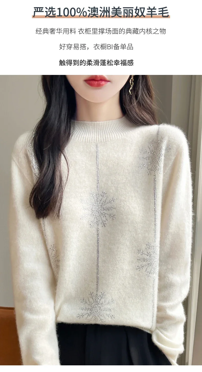 Diamond 100% Wool Sweater 2025 New Women's Fashion Autumn/Winter Warm Hoodie Elegant Half High Collar Jumper Knitted Top