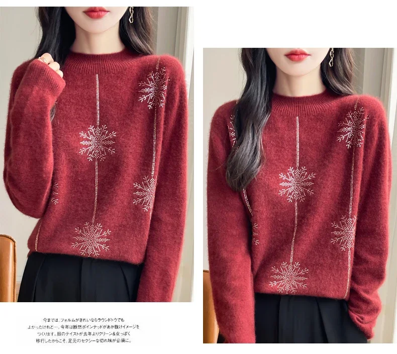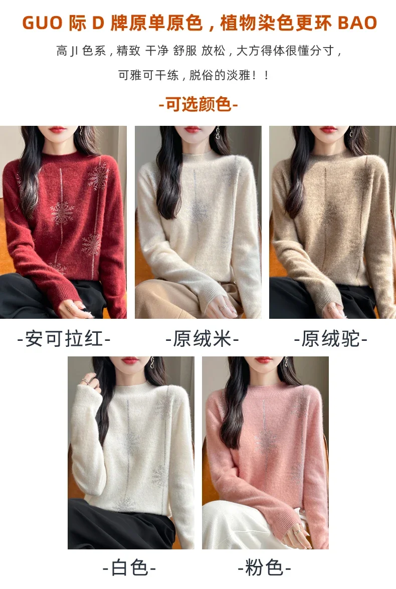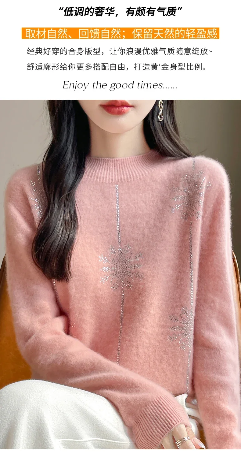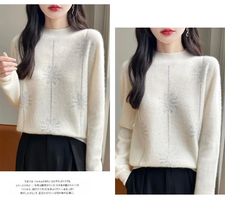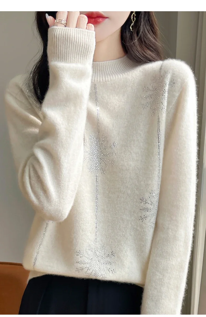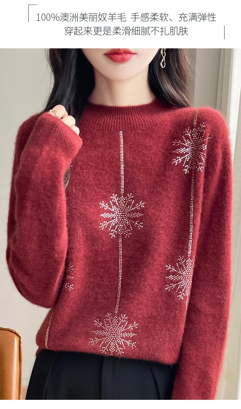 Diamond 100% Wool Sweater 2025 New Women's Fashion Autumn/Winter Warm Hoodie Elegant Half High Collar Jumper Knitted Top