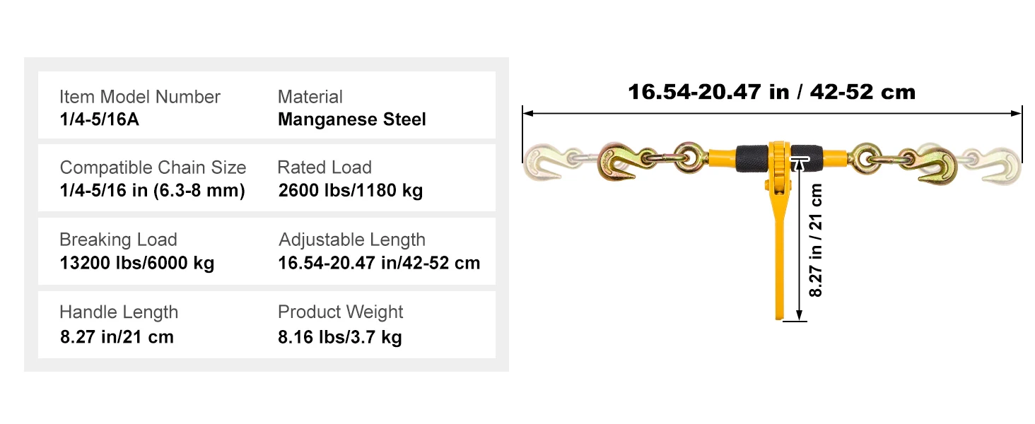 • Compatible with 1/4"-5/16" Chains: Ready for chains between 1/4" and 5/16", this ratchet type load binder includes two hooks, one at each end, to fit your specific needs. The width between the two hooks can be manually adjusted from 16.54 to 20.47 inches (42 to 52 cm).