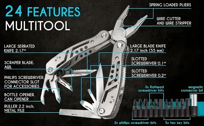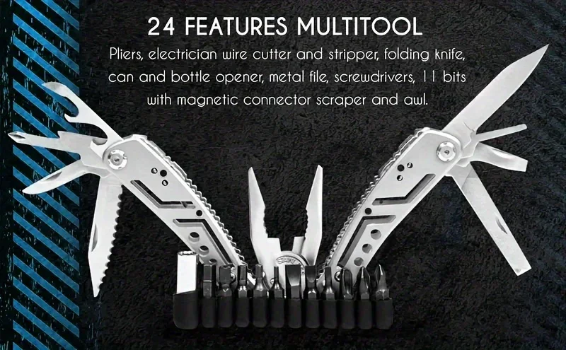 Lightweight Multitool 24 Features - Pliers Electrician Wire Cutter And Stripper Folding Knife Can And Bottle Opener Metal File Screwdrivers 11 Bits With Magnetic Connector Scraper And Awl. It Is A True Multifunction Utility Tool.