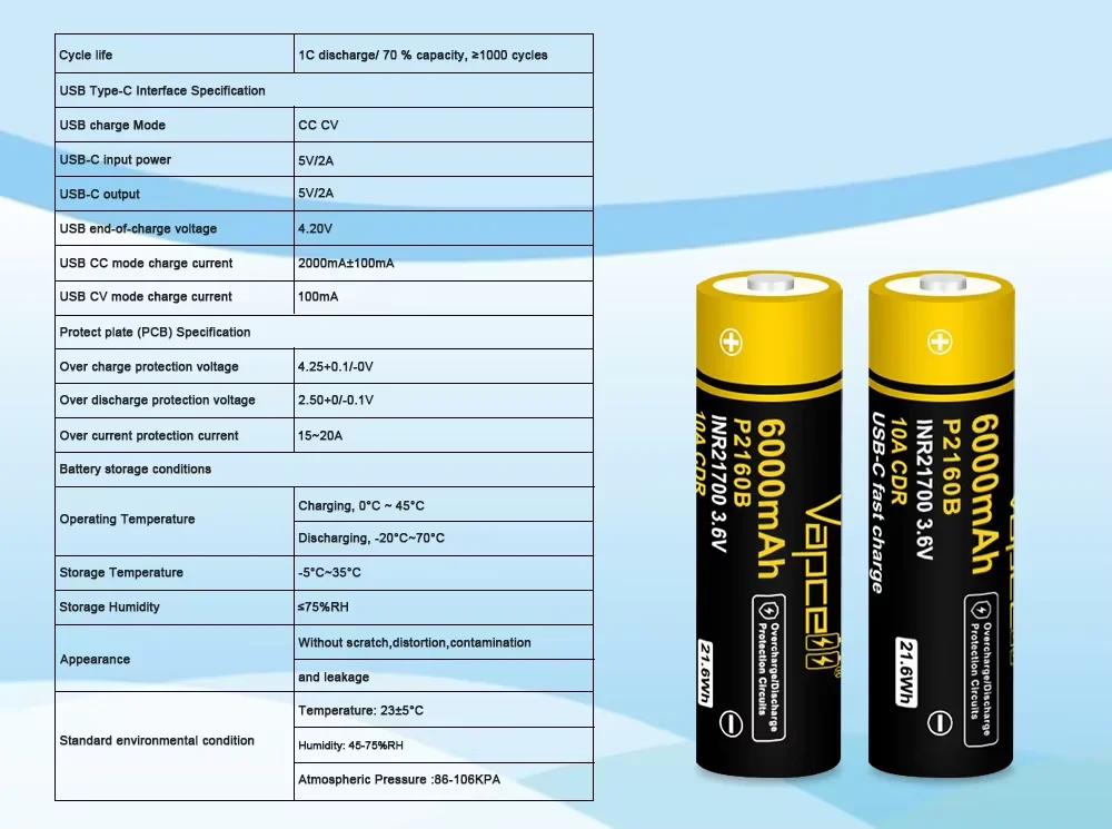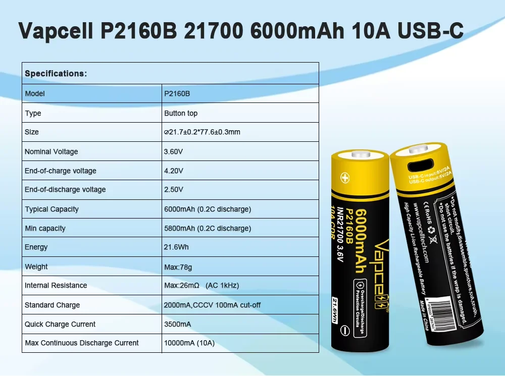 Product name:Vapcell P2160B 21700 6000mAh Type-C Rechargeable Li-ion Battery