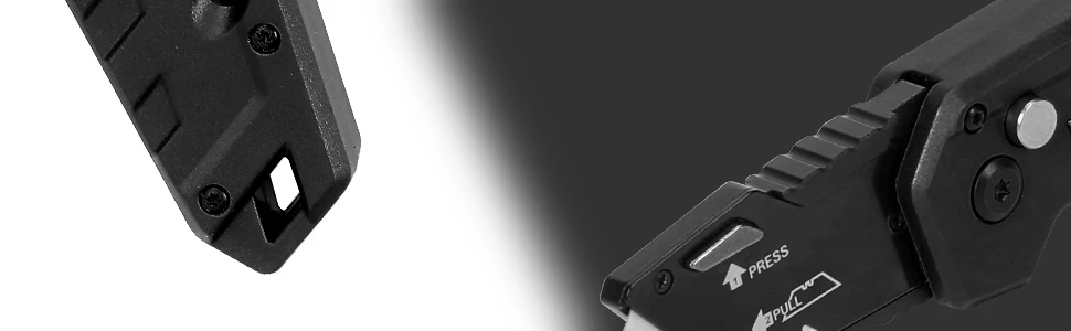 The ergonomically designed button on the handle allows you to easily flip out the blade. After the blade is installed, please hold down the button, swing the blade to the closed position, and put it in your pocket.