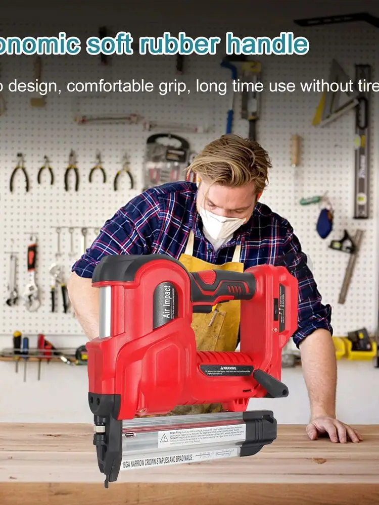 This nailing machine is easy to use, support both straight nails and n-shape nails, improve the flexibility of the use of the machine, improve work efficiency. High-power copper wire motor, with surging power and strong penetration, fast continuous nailing, and long motor lifespan. High-strength alloy nozzle and nail cartridge, spring snap positioning, installation/fixing/nailing one machine control, improve operating efficiency. Suitable for home decoration, waterpipe installation, woodworking, cabinet refurbishment, ceiling fixing, frame building, and so on.