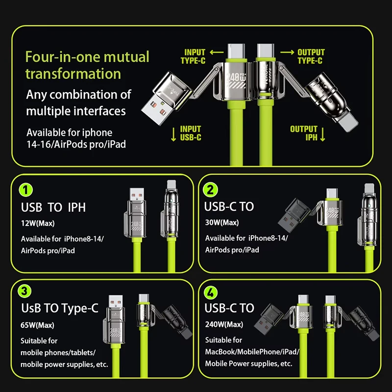 Xiaomi 4 in 1 240W Fast Charging Cable PD USB iPhone Interface Fast Charging Kirsite Cable For iPhone8-16 ProMax iPad Samsung