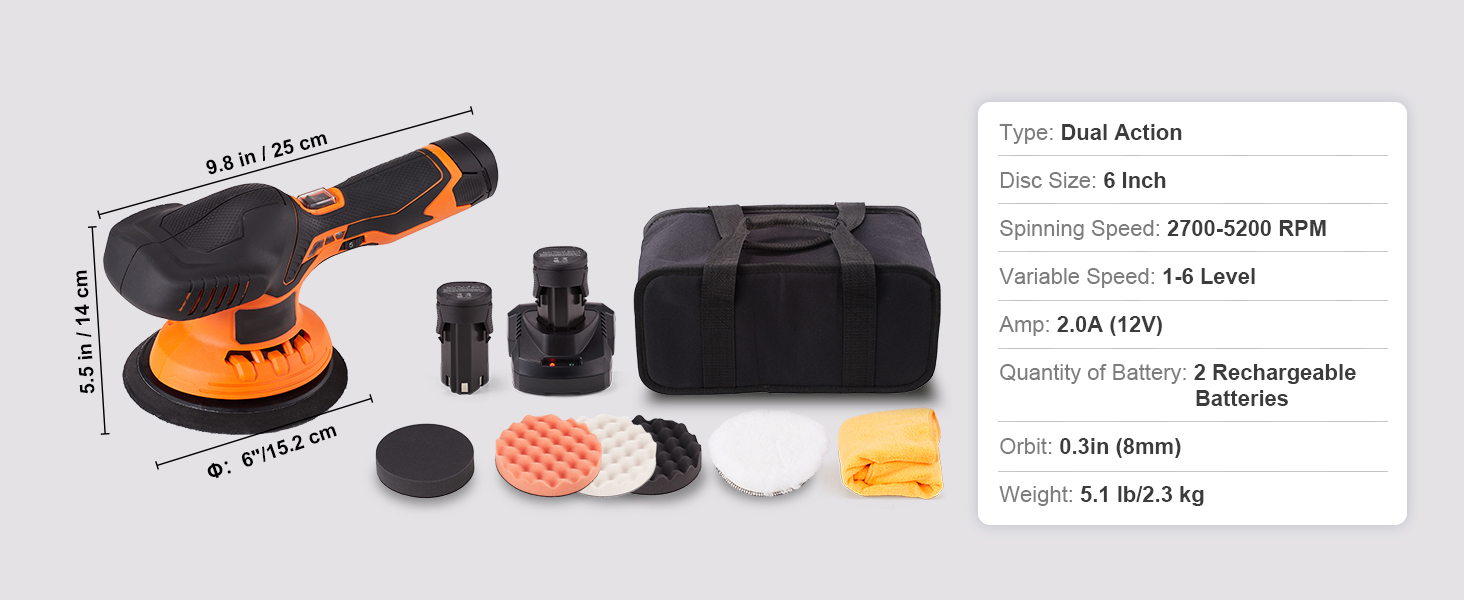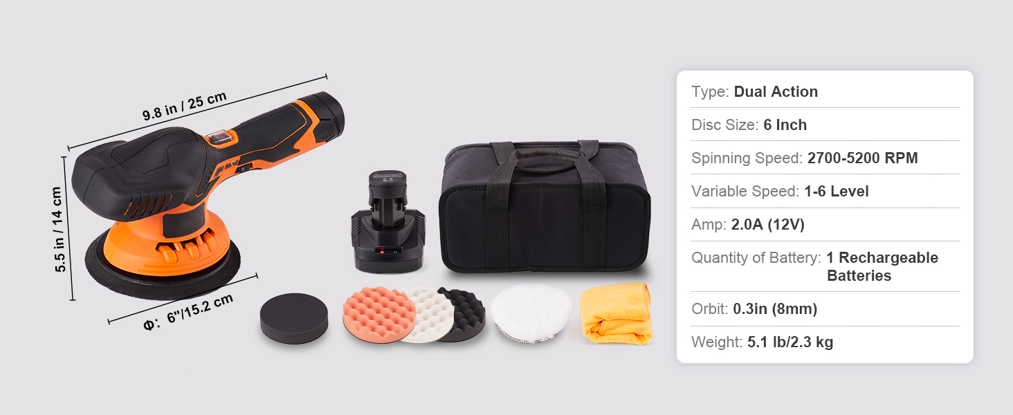 Everything You Want: This all-in-one kit includes 1 DA polisher, 4 foam pads, 1 wool pad, 1 bag, 2 batteries 2.0Ah, and a fast charger. No more searching for additional accessories, as the VEVOR car buffers and polishers kit has everything you need. Choose between three high-quality PU pads to match your desired finish, and work right out of the box!