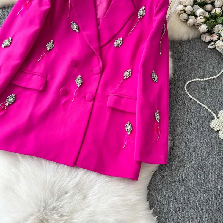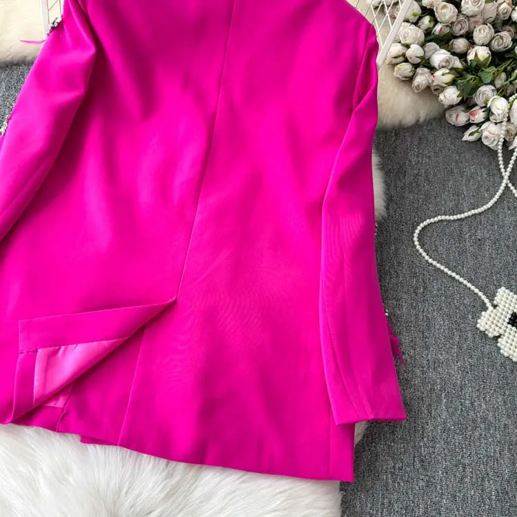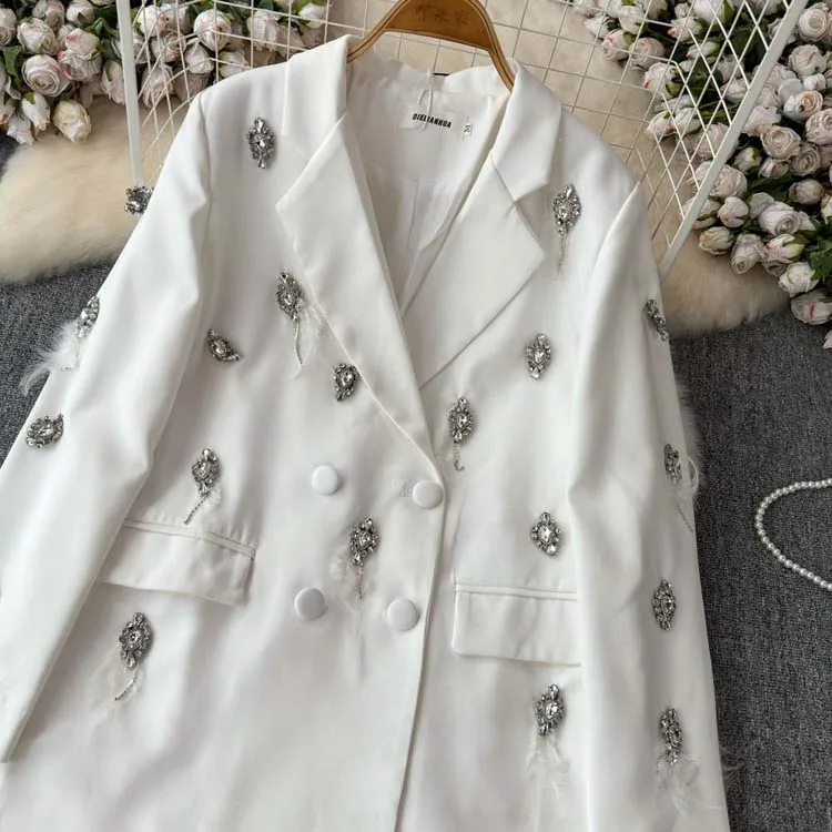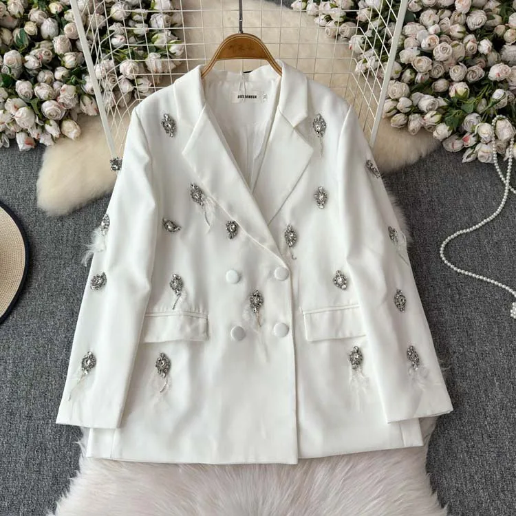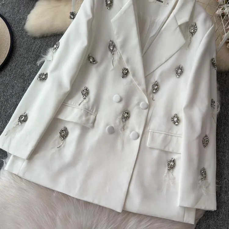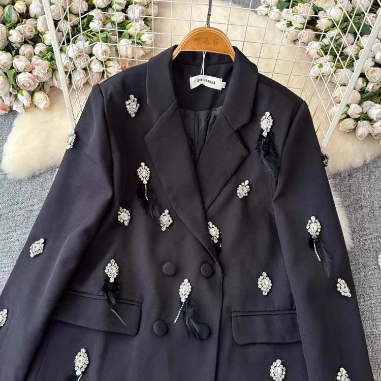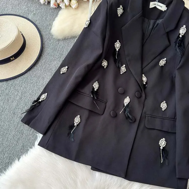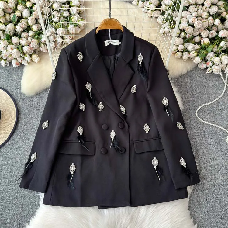 2025 Collection Faux diamond blazer Large size Luxury Feather rhinestone Double breasted jacket Spring Fall Ladies INKEO 5O003