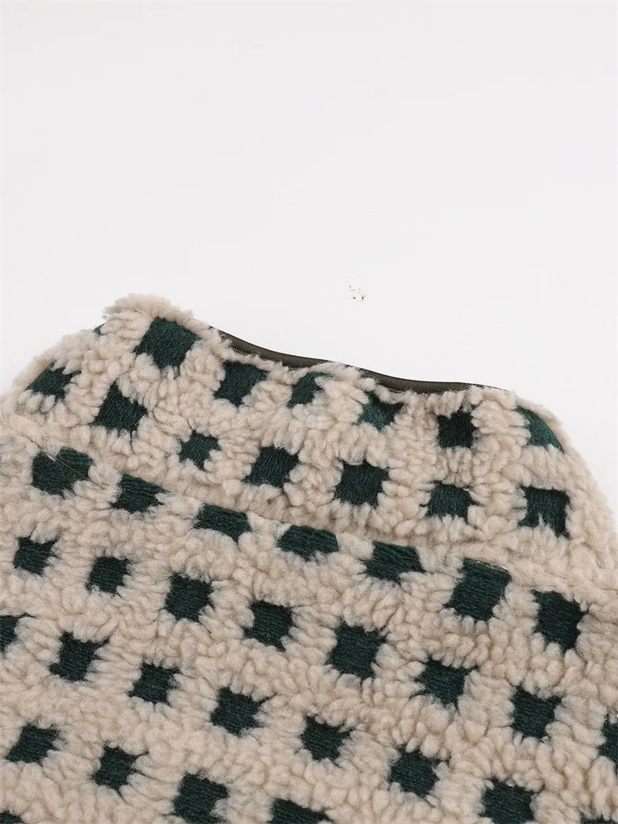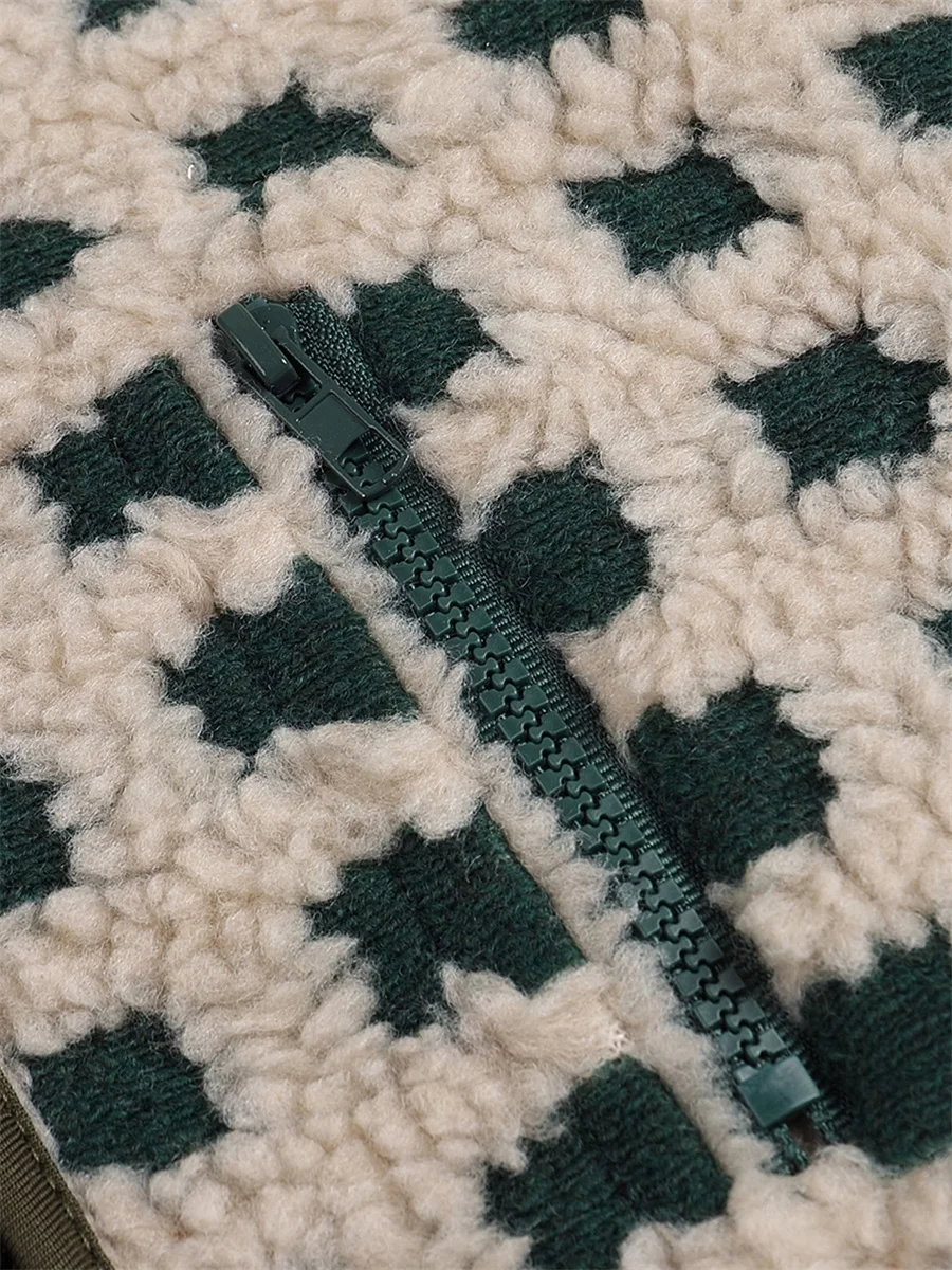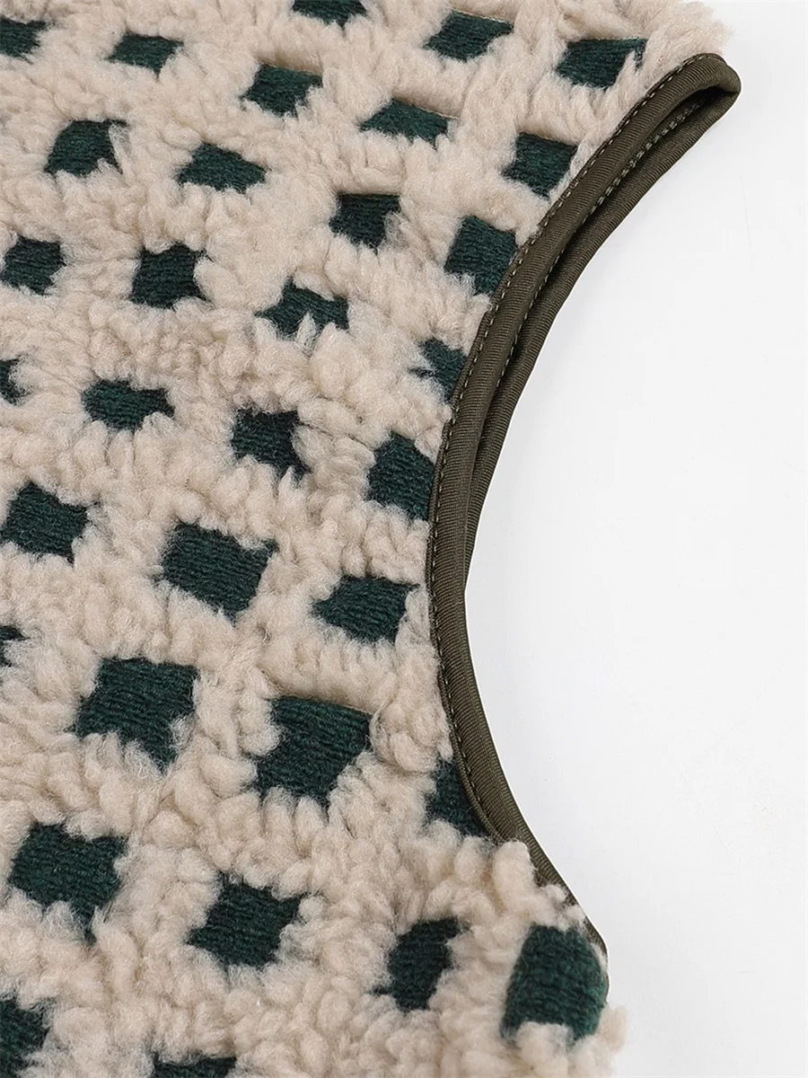 Womens Fuzzy Checkered Vest Sleeveless Stand Collar Zip Up Vest Jacket Winter Warm Outwear