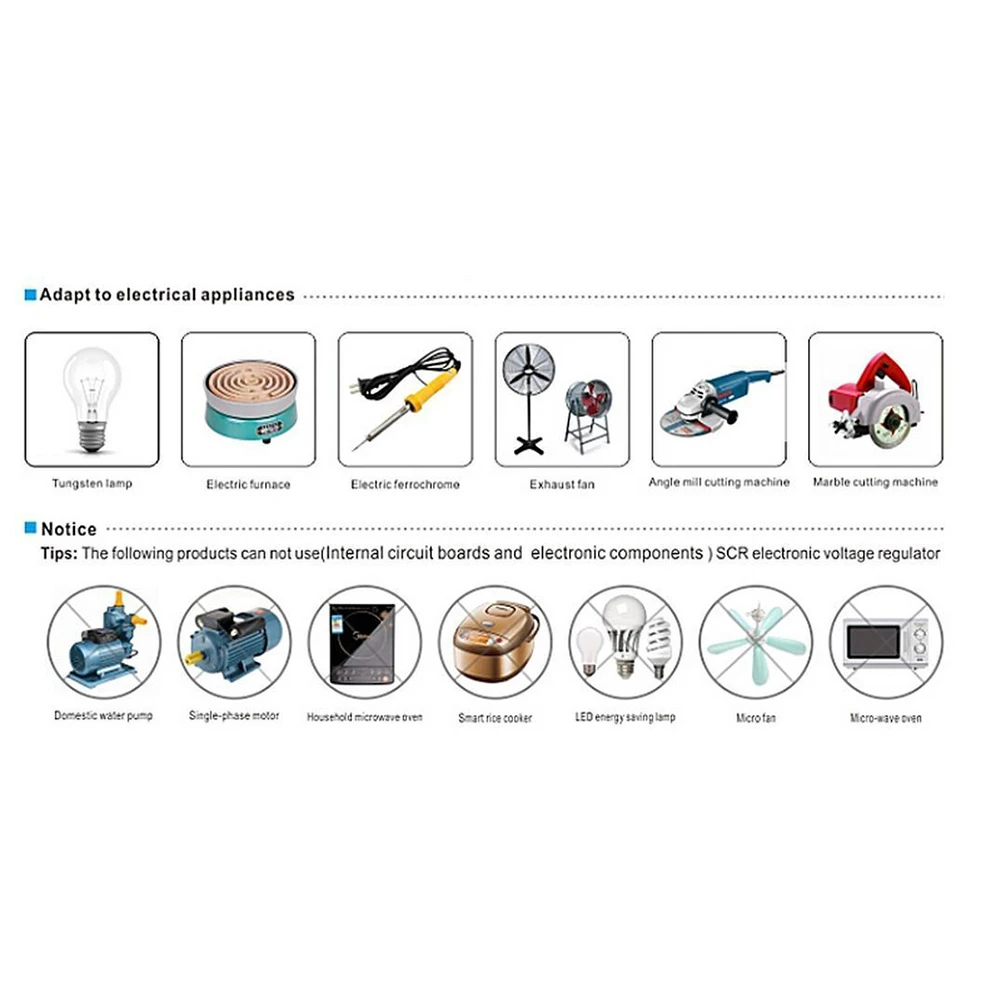 * Wide application: The speed regulator can adjust speed, temperature, voltage, and lighting. It is widely used in exhaust fans, filament light bulbs, electric furnaces, angle grinders, marble machines, and blowers. Note: It cannot be used in electrical appliances with circuits. Microwave ovens, induction cookers, rice cookers, water pumps, washing machines, LED energy-saving lamps and other boards and capacitive electronic components