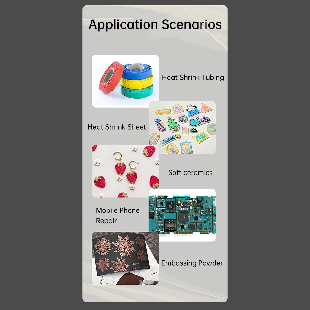 5. Wide range of applications: suitable for industrial use such as soft ceramics, reliefs, heat shrink sheets, heat shrink tubes, mobile phone maintenance, disassembly of small components, etc.