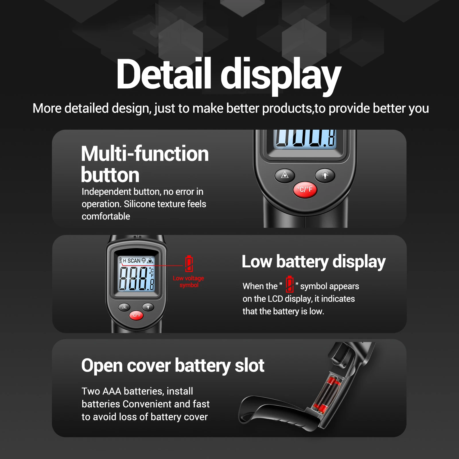 【90 Degree Batteries Cover Upgrade】With a new E-Z to open design, the temperature gun battery cover drops down a full 90 degree giving more space for battery changing.